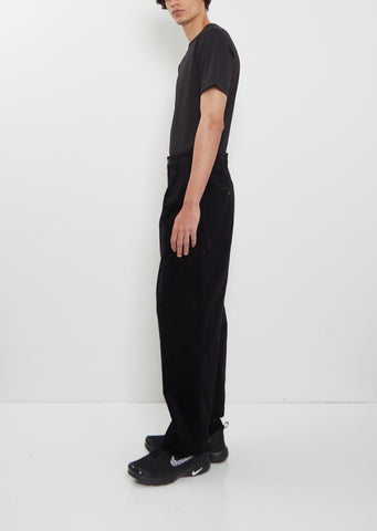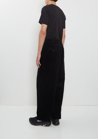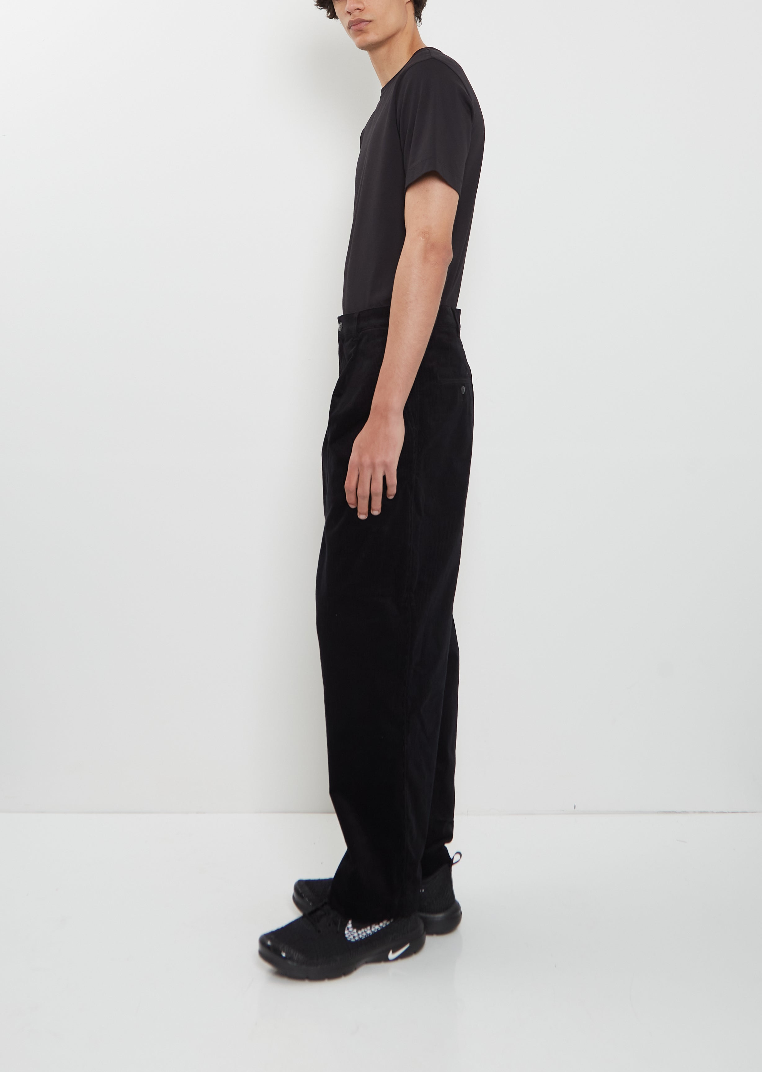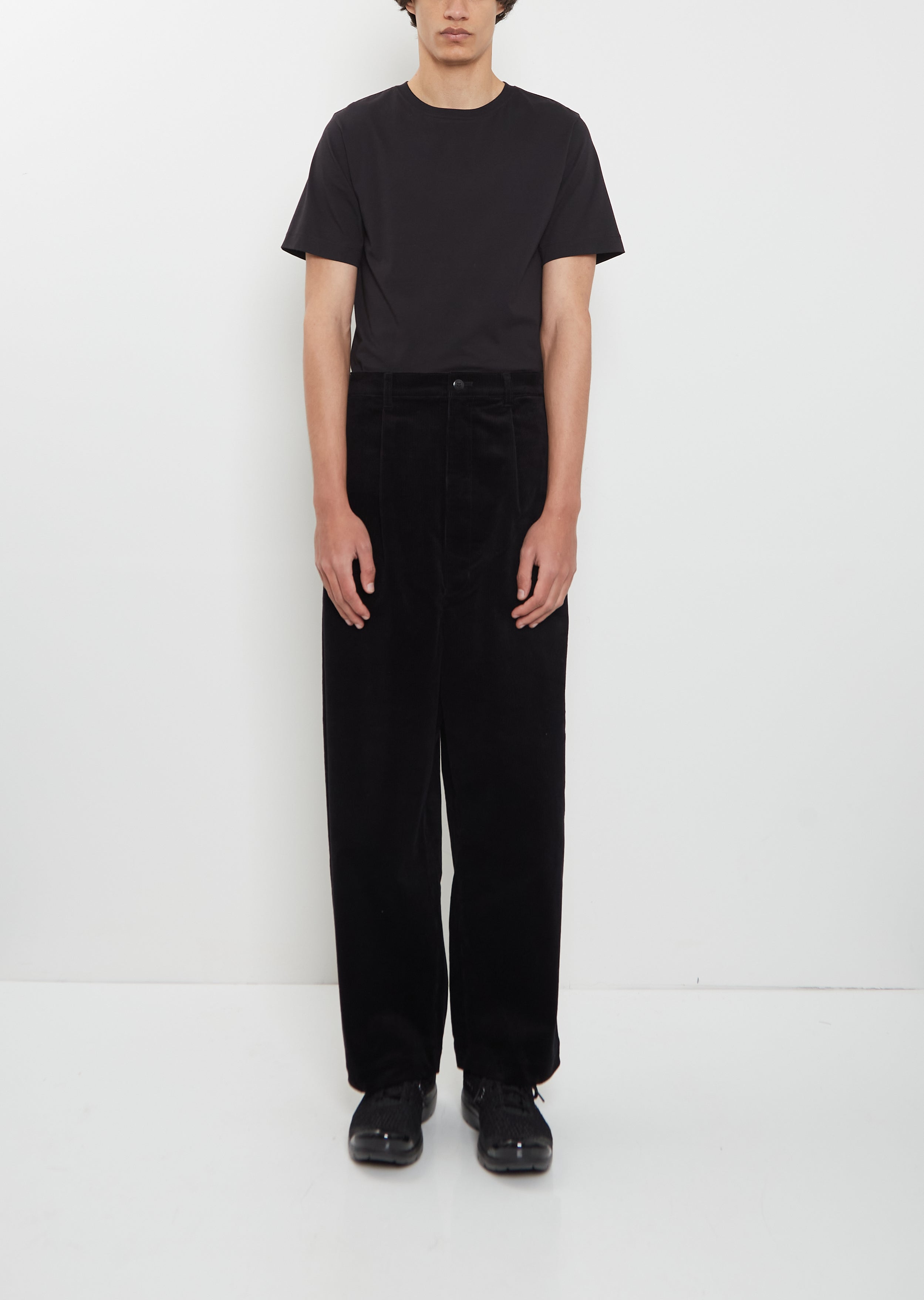 Junya Watanabe MAN black pants with straight legs and pleats at front in soft cotton corduroy. Features belt loops, angled pockets, welt pockets at back and a button and zip-fly fastening.