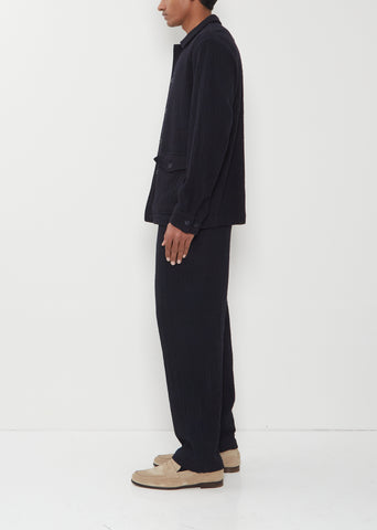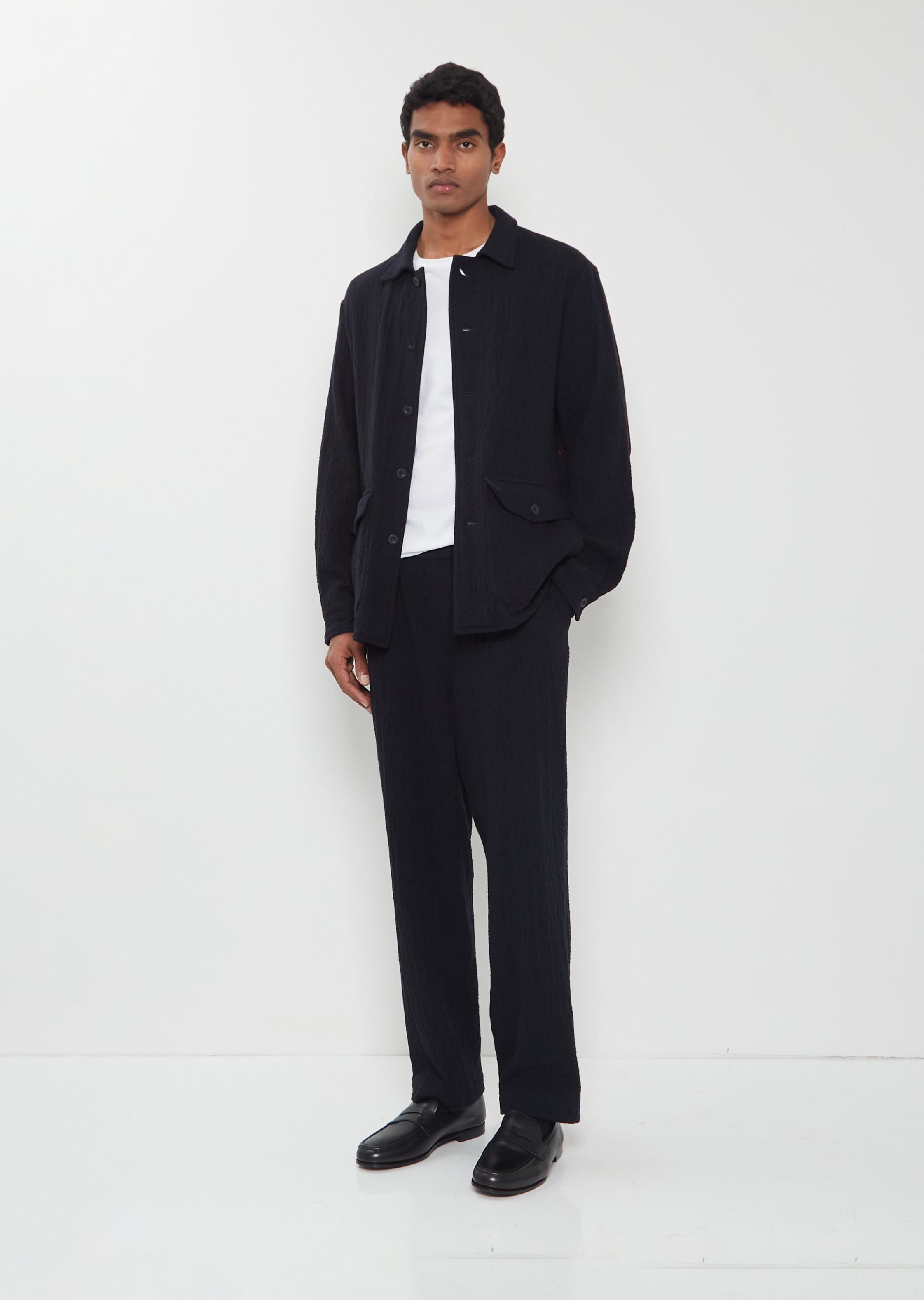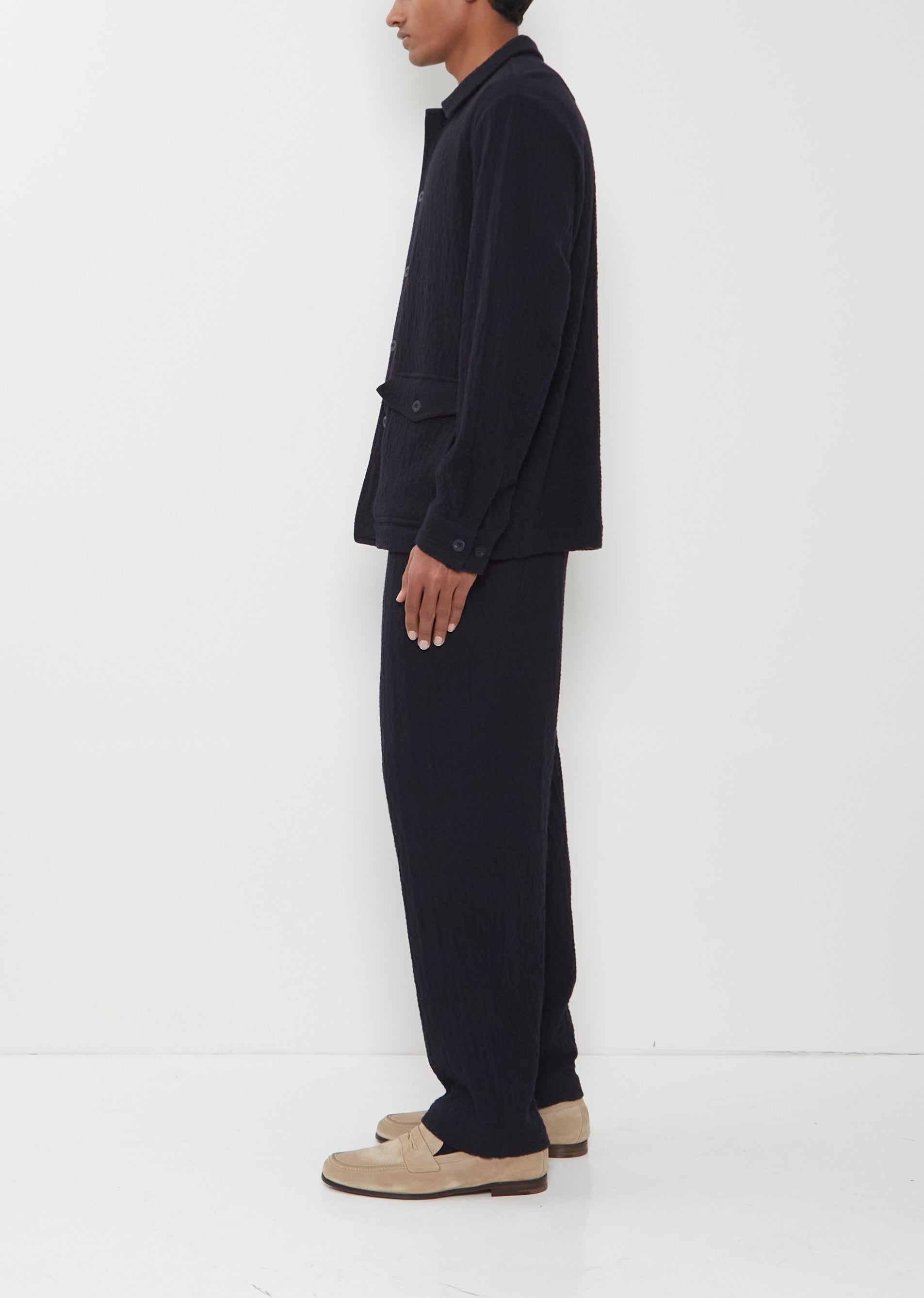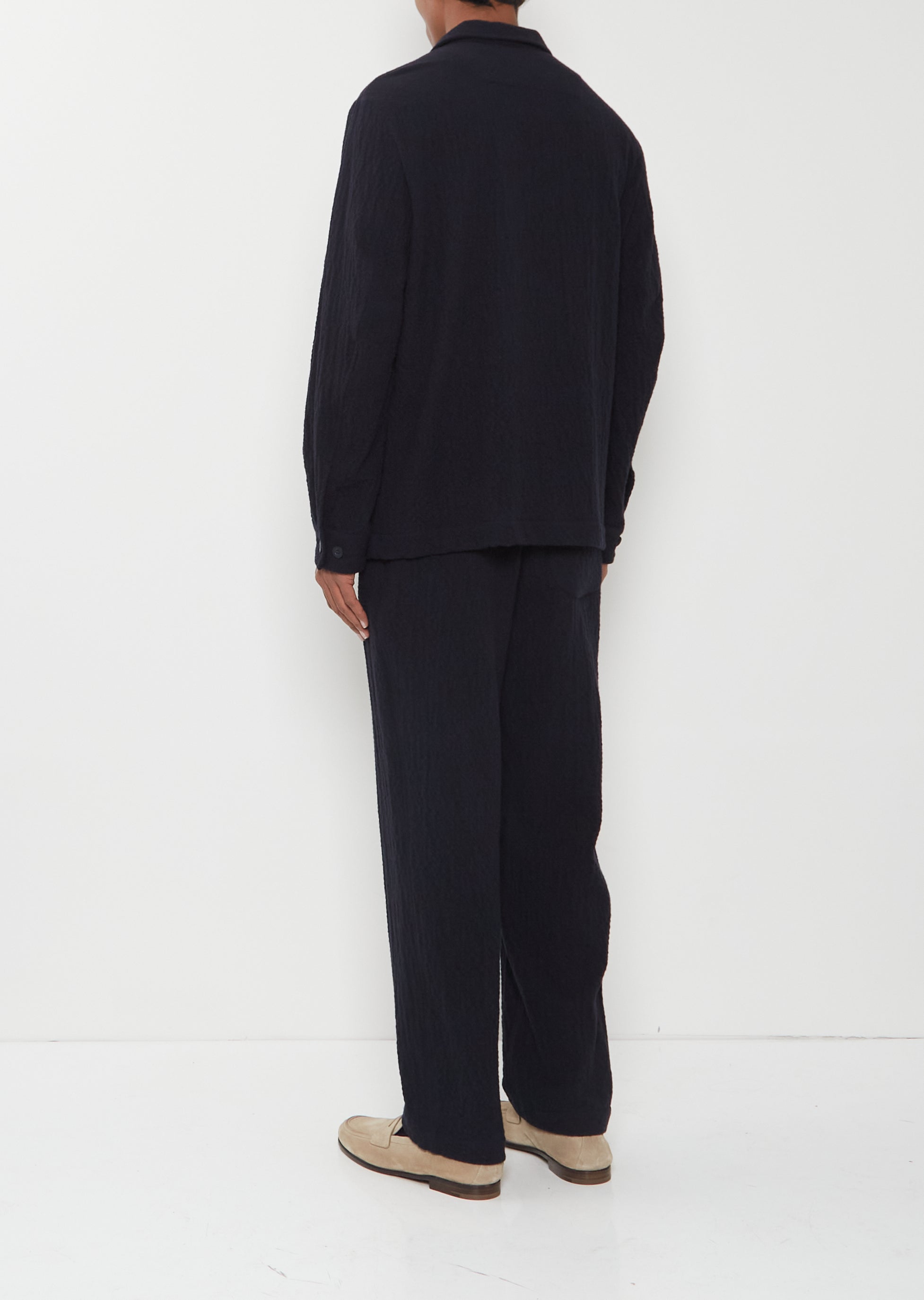 Casey Casey navy shirt with a spread collar and tonal button front in a soft cashmere blend with a seersucker effect. Features dropped shoulders, buttoned flap patch pockets with side entry, and buttoned cuffs.