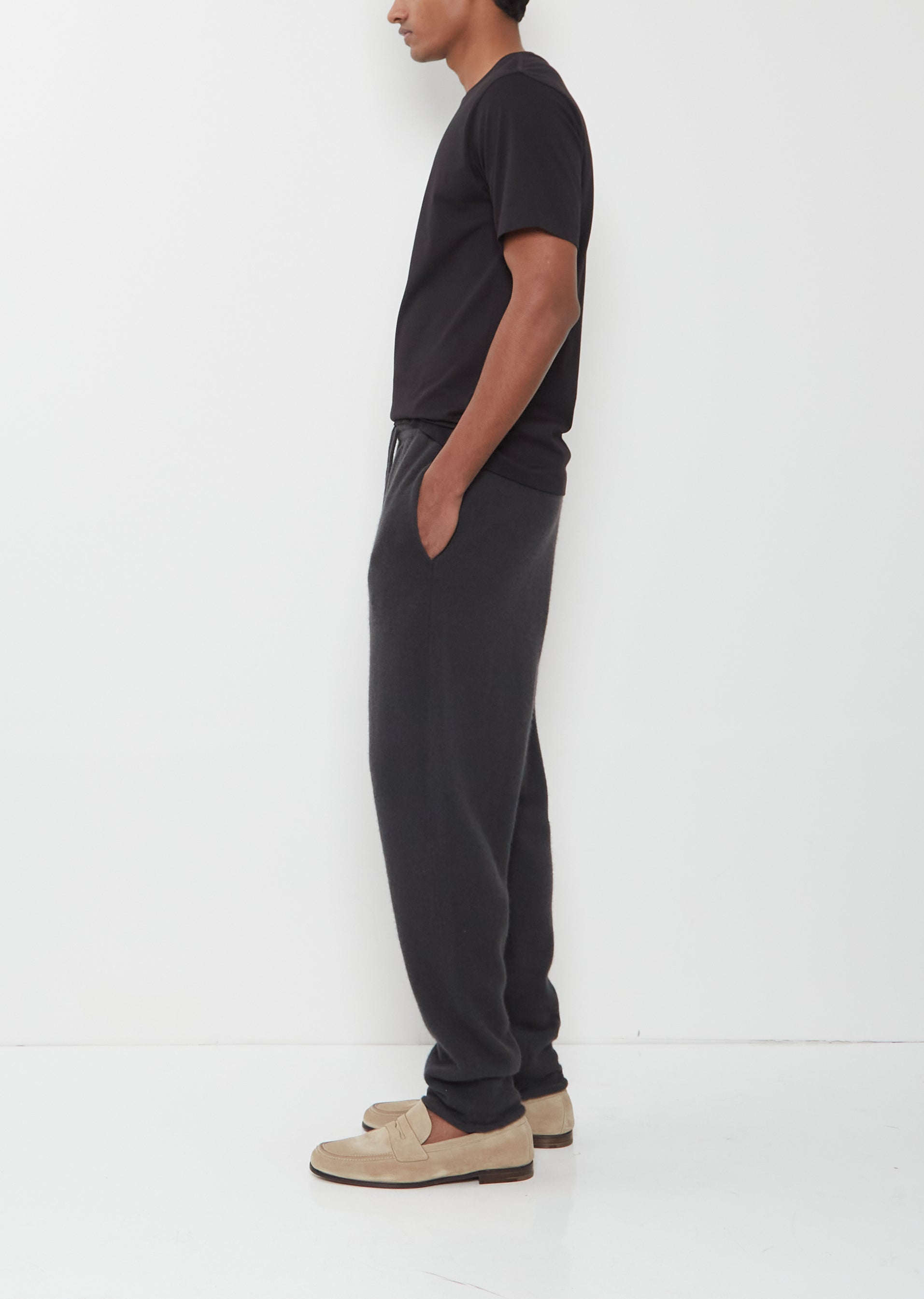 Casey Casey grey pull-on pant with tapered legs and an elasticated drawstring waist in superfine wool knit. Features side seam pockets, patch pocket at back, and rolled edge finish at cuffs and back pocket.