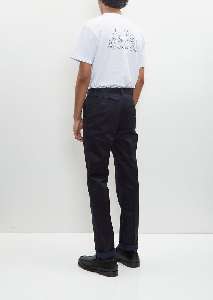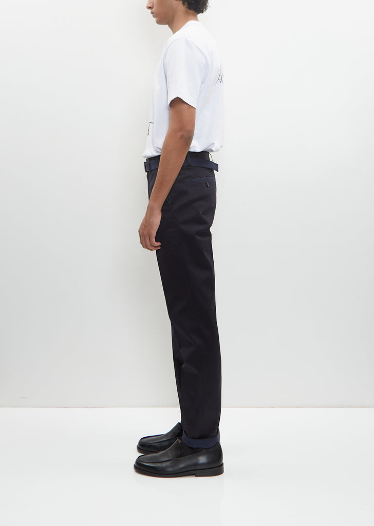 Sacai navy chino pants with front and back pleat in cotton twill. Features belt loops, self belt with branded silver-tone buckle, angled side pockets, buttoned welt pockets at back and button and zip-fly closure.
