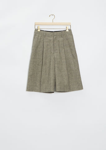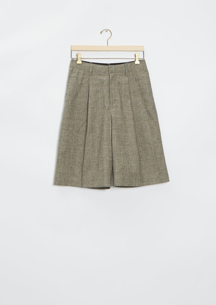 6397 grey plaid pleat-front elongated shorts in a linen and cotton blended twill.