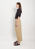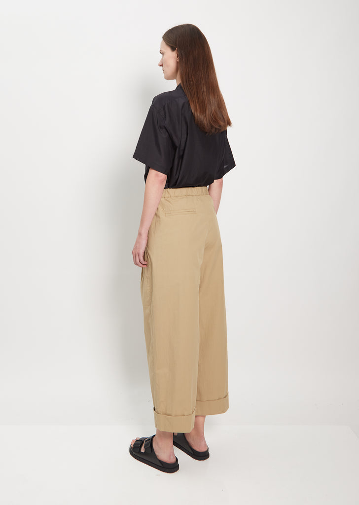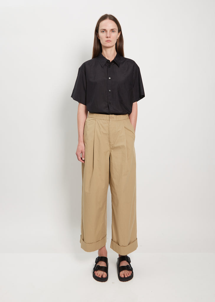 6397 khaki wide leg trousers with single front pleats in cotton twill. Features rolled cuffs, angled side pockets, belt loops, and concealed zip with button at top.