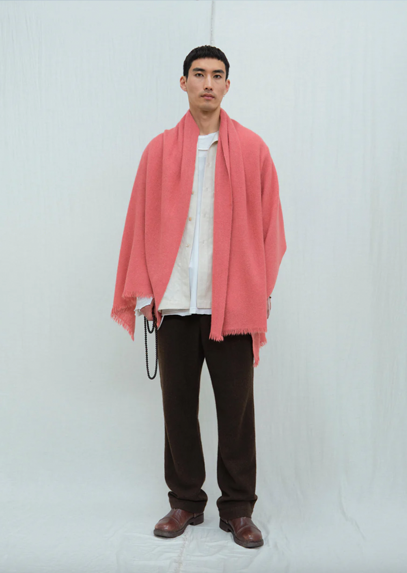 Norlha natural pink oversized rectangular scarf with raw fringing in soft yak wool sourced from local nomad cooperatives in Tibet.