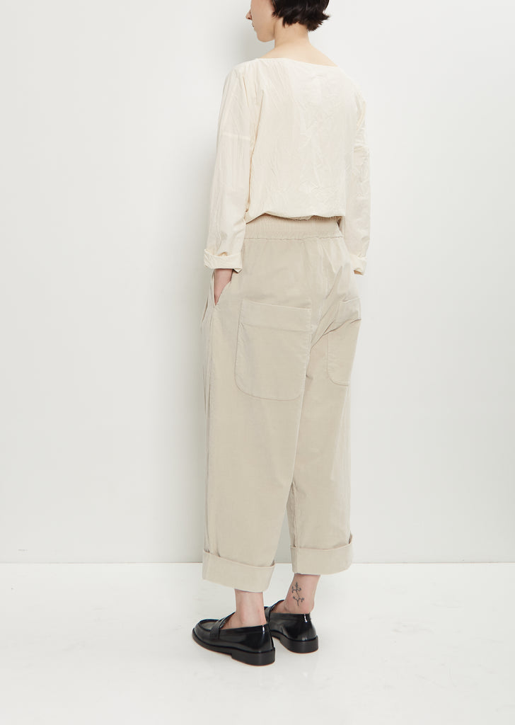 Album di Famiglia oatmeal beige cropped trousers with two pleats at front and cuffed legs in stretch cotton velvet. Features elasticated waist, interior tonal drawstring, faux placket, side seam pockets, and large patch pockets at back.
