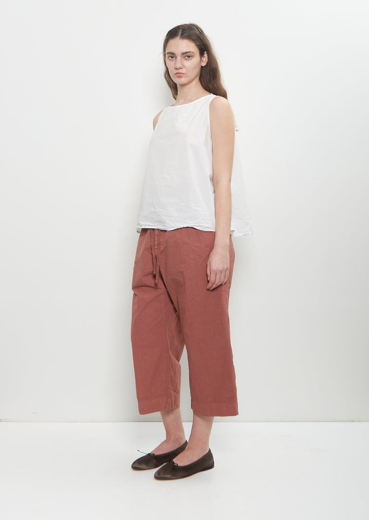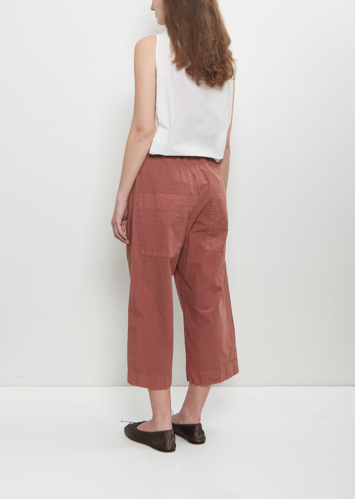 Album di Famiglia coral wide leg cropped trousers with an elasticated waist and self drawcords at front in washed compact cotton canvas. Slightly dropped crotch. Slash pockets at sides. Relaxed fit.