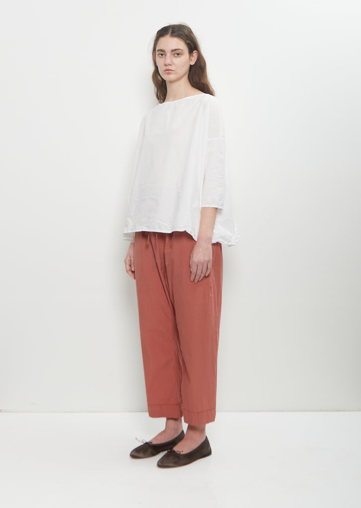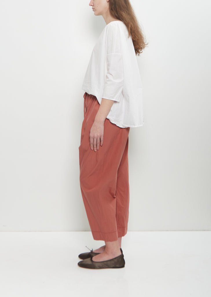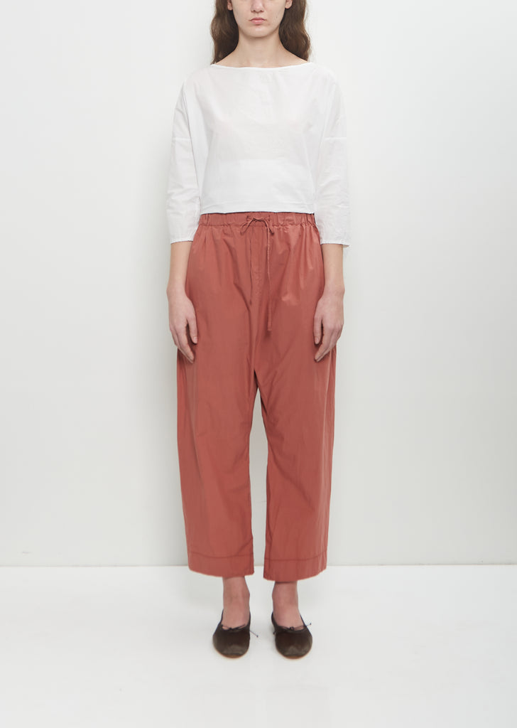 Album di Famiglia signature pull-on trousers with cropped, tapered legs in coral lightweight tissue cotton. Features an elasticated waist with exposed self drawstring, and side seam pockets.