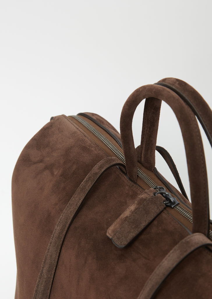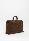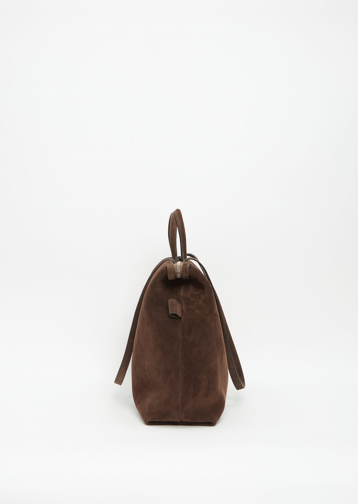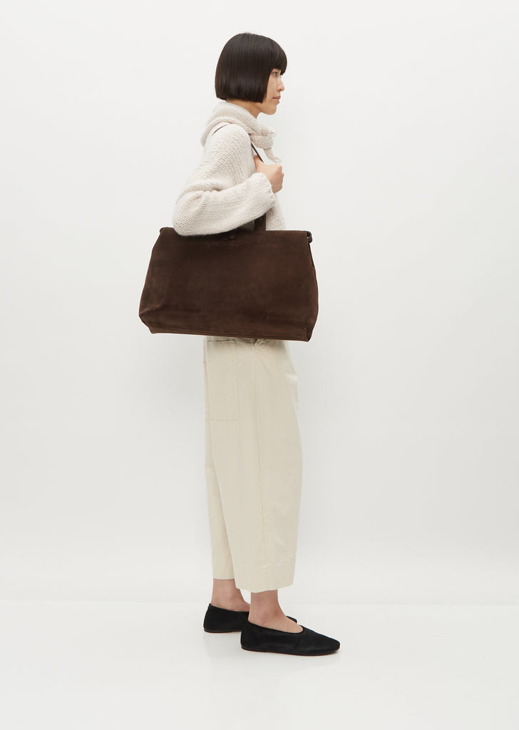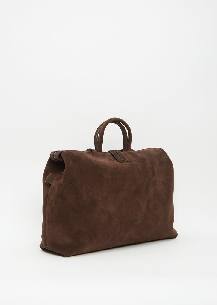 Marsèll signature top-handle luggage bag in chlorophyll green suede leather with cinch-able sides and multiple carrying options. Top zip closure. Side snaps for an adjustable shape. Interior flap pockets; interior leather patch pockets atop a zip pocket. Optional crossbody strap included.