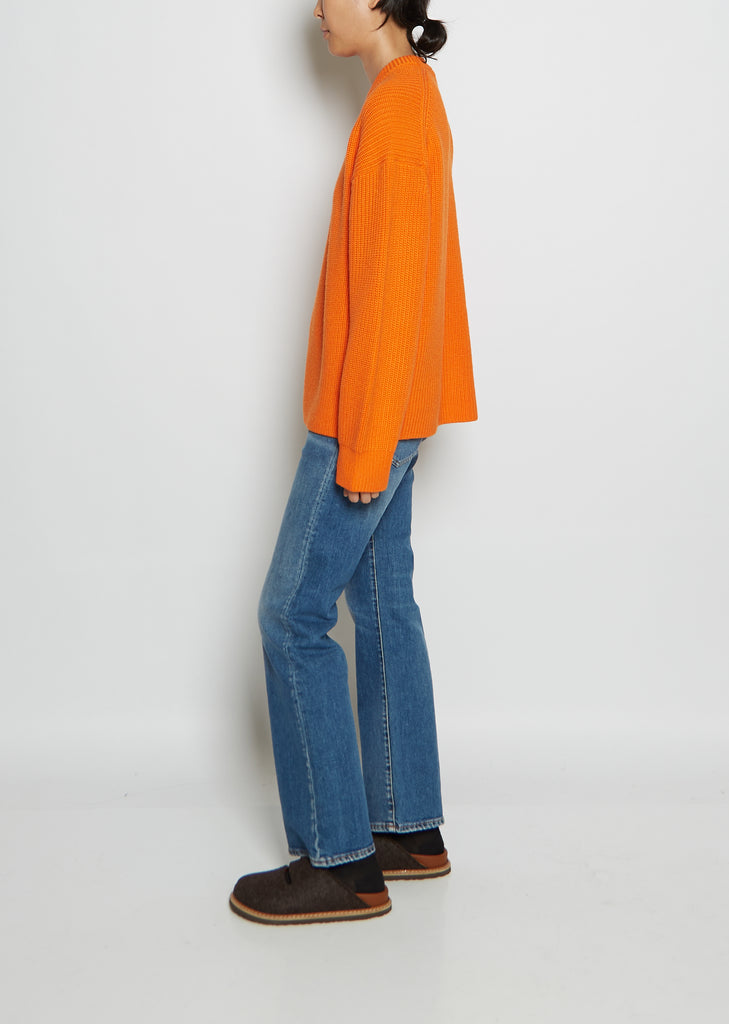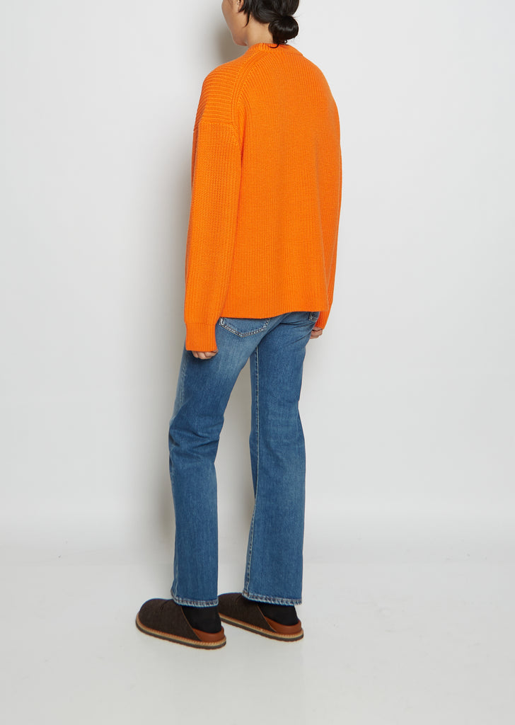 6397 bright orange ribbed crewneck sweater with a rib-free hem in chunky wool. Rib trim finish at round neckline, sleeve cuffs.
