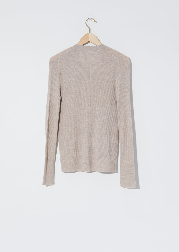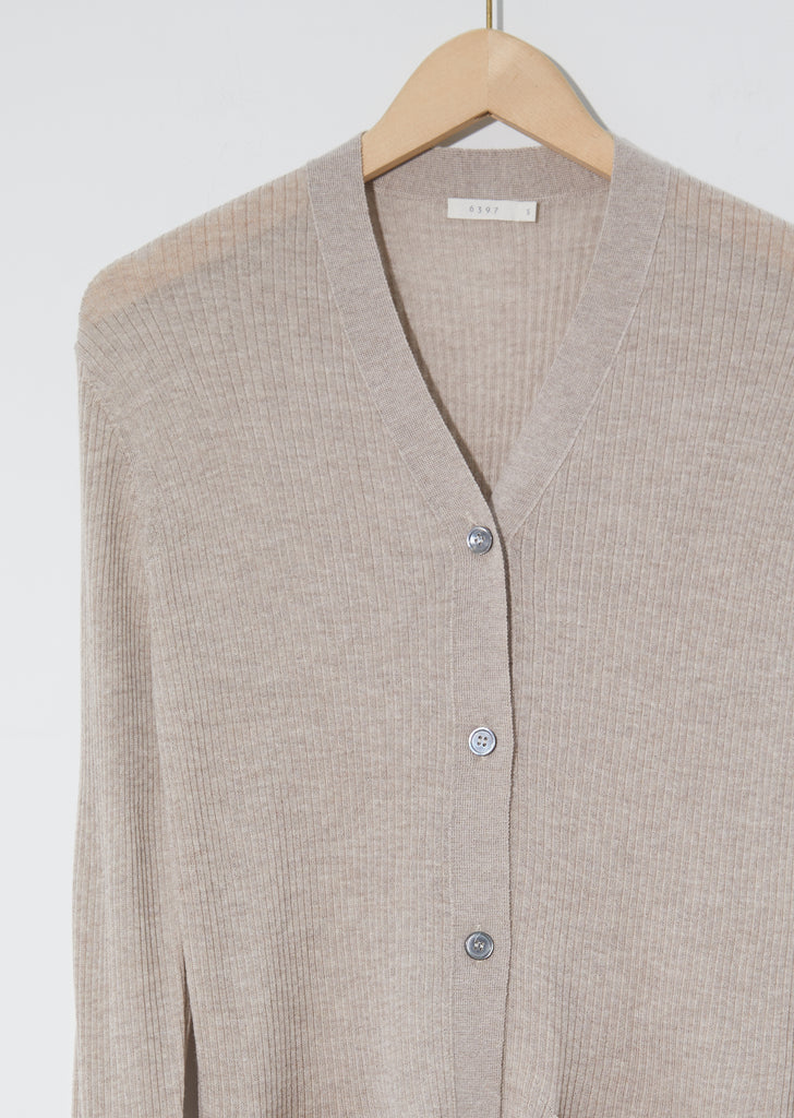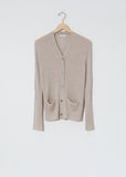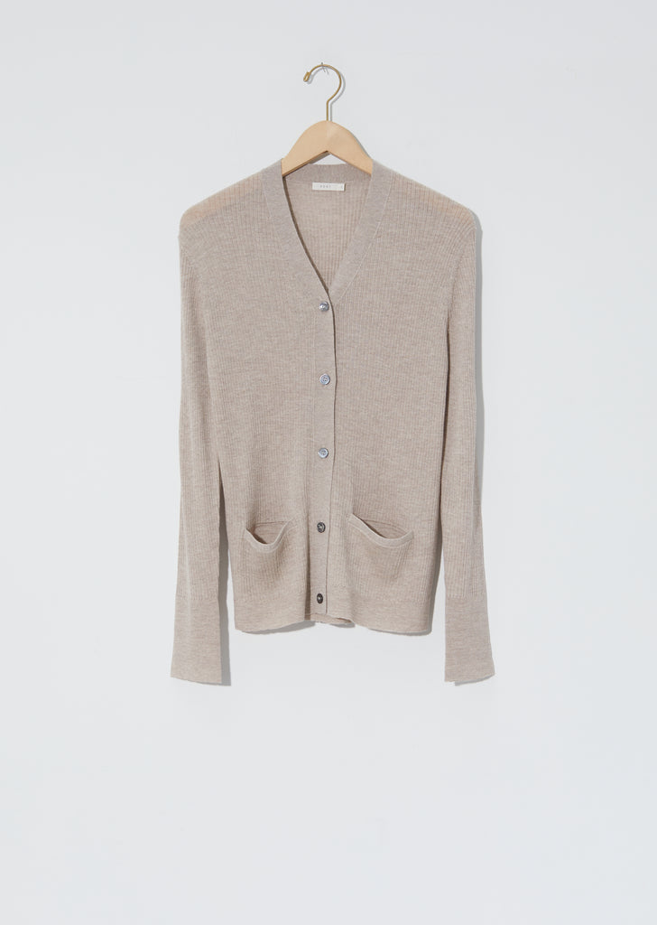 Poor Boy Cardigan in Oatmeal. Light merino wool V-neck cardigan accented with shell buttons and small welt pockets.