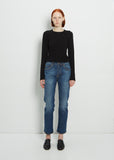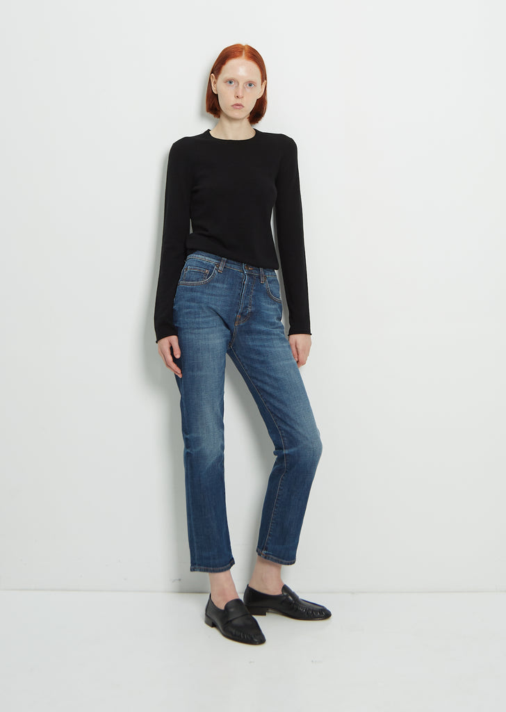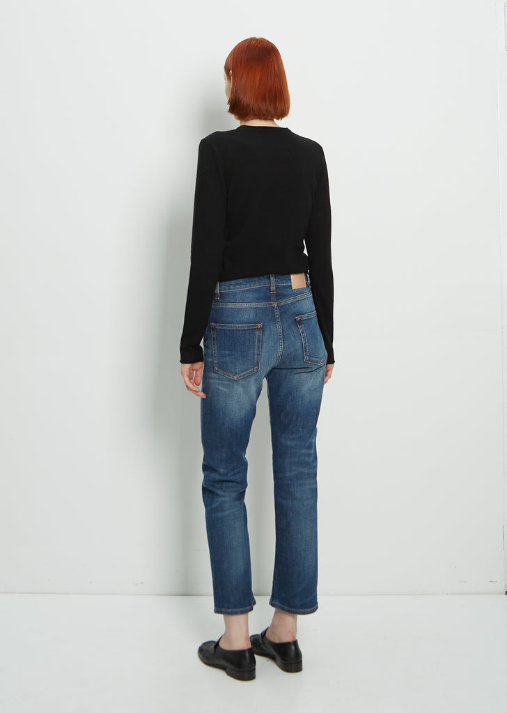 6397 classic cropped straight-leg denim pant with 5-pocket styling in used blue wash made in stretch cotton. Button fly fastening.