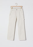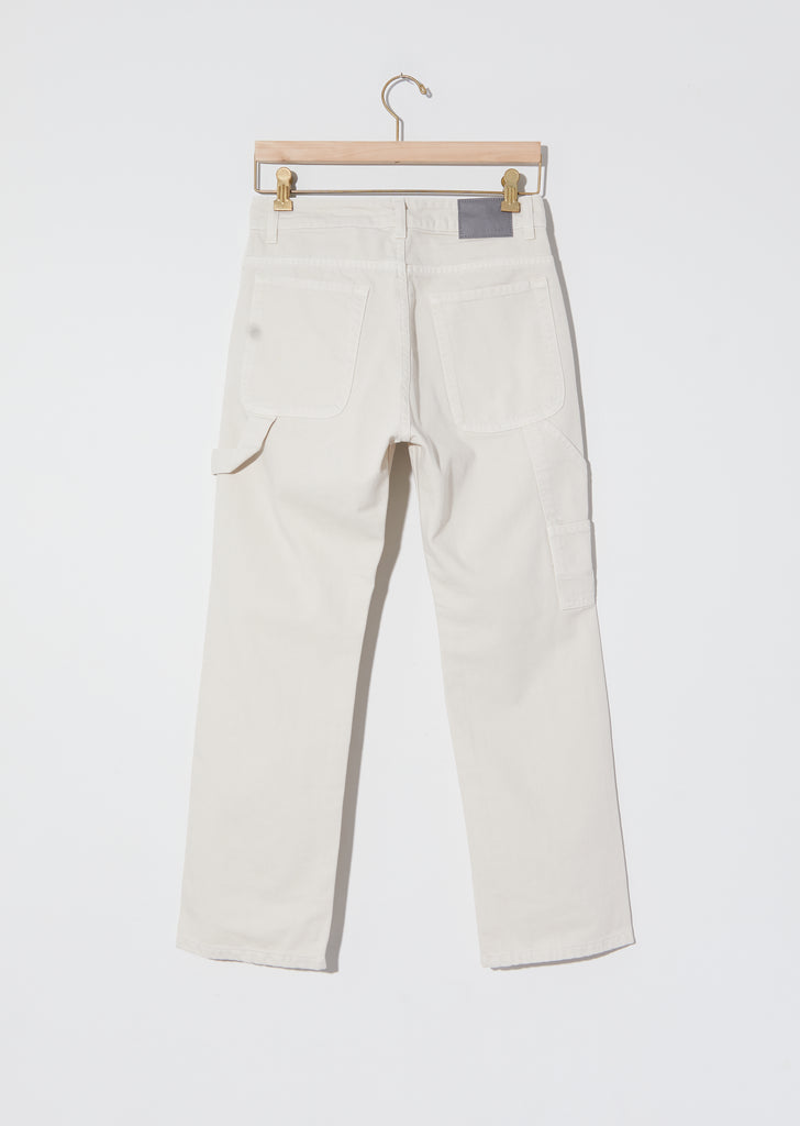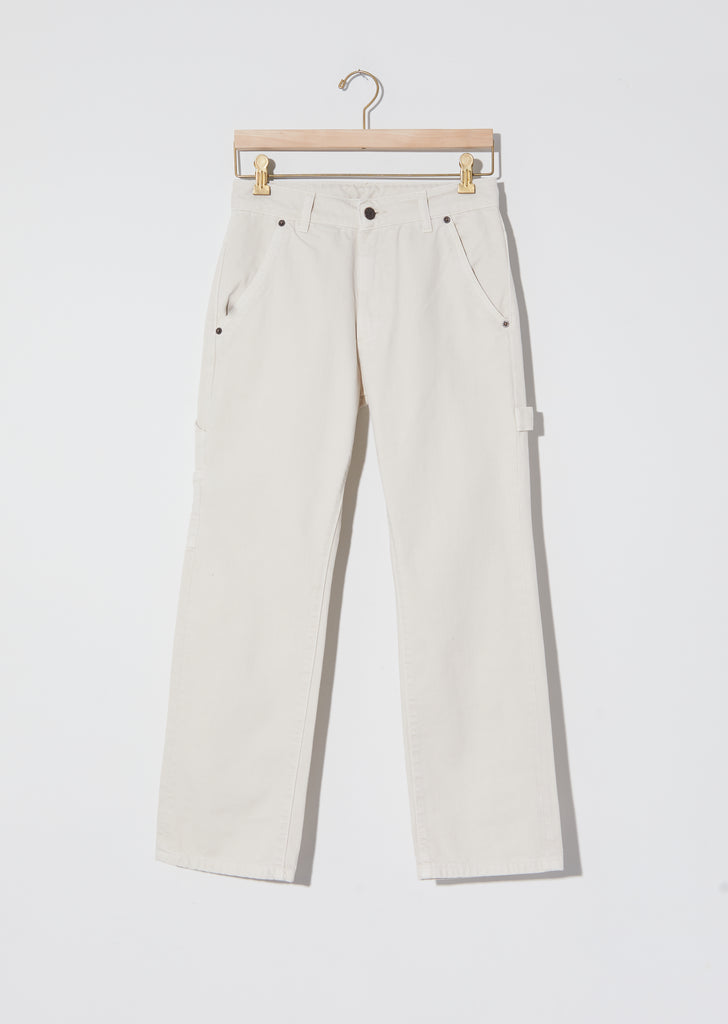 6397 Carpenter Jeans in Washed Putty wash. The label's signature cropped jeans with front angled pockets and back patch pockets, featuring classic carpenter pant detailing in a light grey wash.