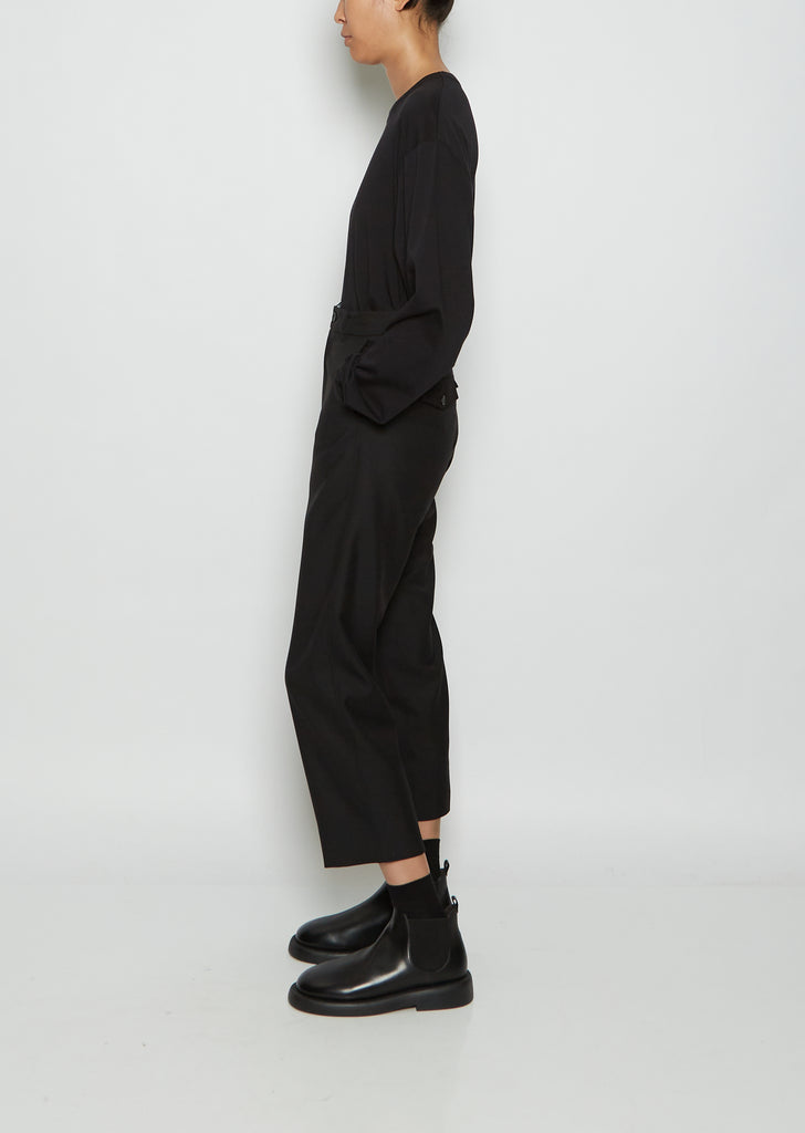 Adnym Atelier smokey black high-waisted tailored trousers with slim, cropped legs made in a virgin wool blend. Featuring an exposed single button at front and double buttoned flap pockets at back.