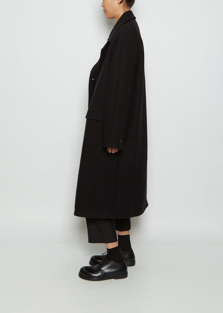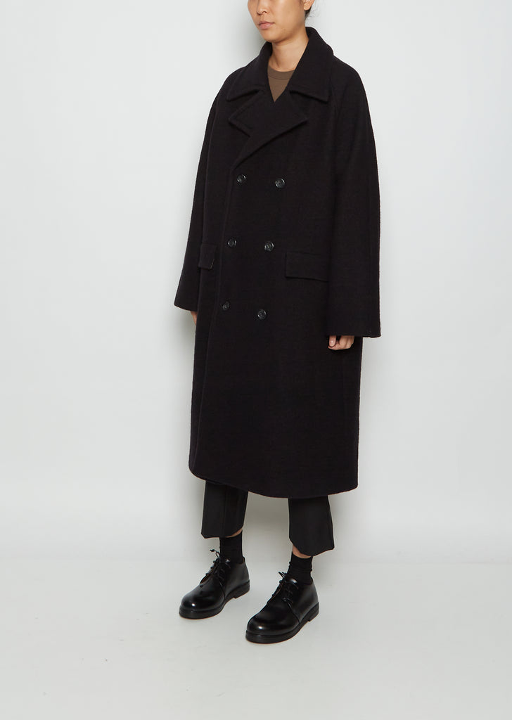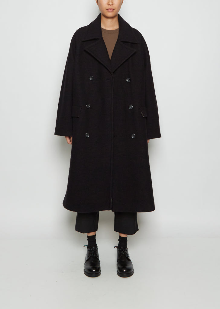 Adnym Atelier black double-breasted oversized coat with a notch lapel, saddle sleeves and a center back vent in virgin wool.