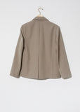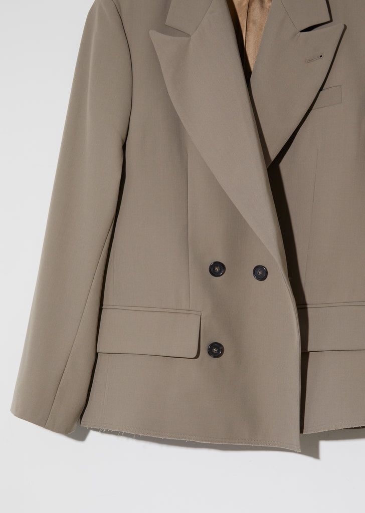 FW'20 Collection — Andym Atelier Slash Double Breasted Jacket in Taupe. Oversized blazer with a classic notch collar and cut-off hem effect. Double-breasted front panel closure with hidden button detail.