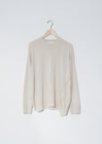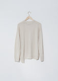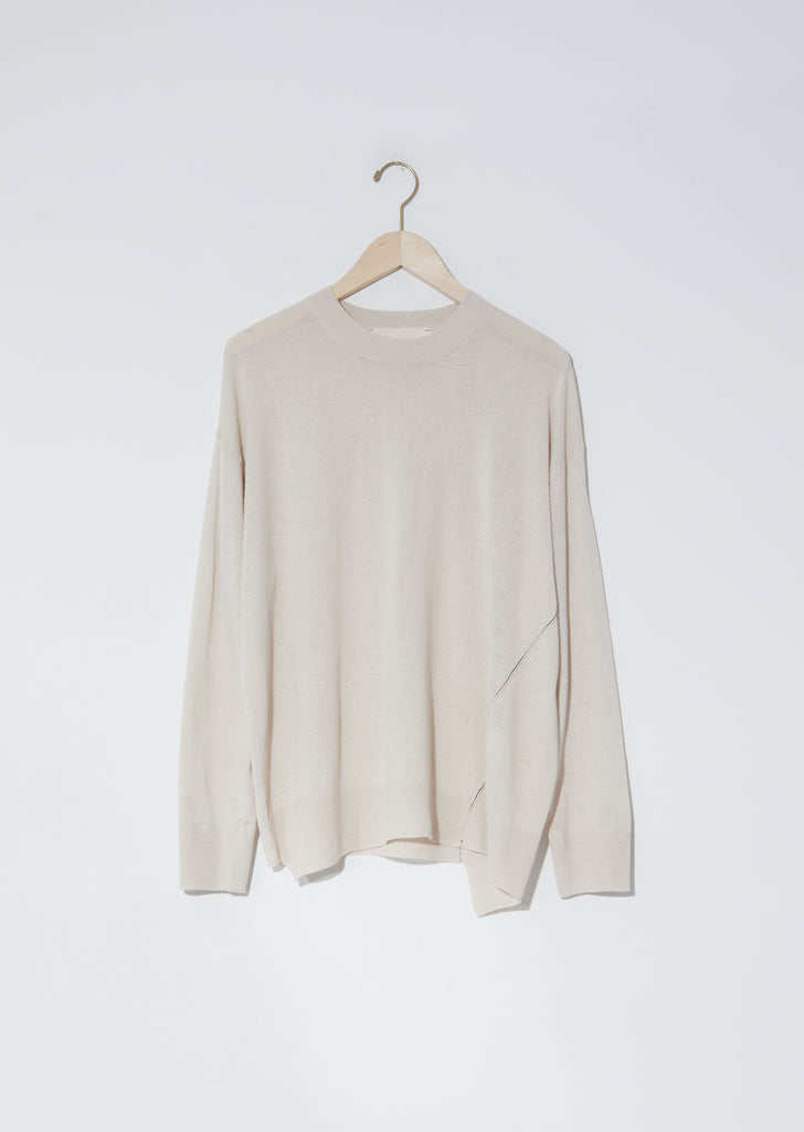 Spring-Summer '21 Collection — Adnym Atelier signature Labi knit sweater with asymmetrical cut & sew construction in ramie and viscose knit. Detailed with contrasting link-thread in white. Straight silhouette with an oversized fit.