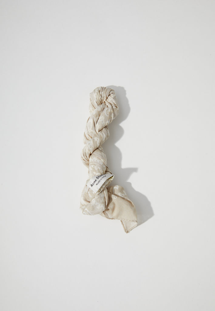 Acne Studios’ Violett bandana scarf is crafted of paisley-printed taupe-grey cotton batiste with a crinkly hand. This square-shaped unisex accessory is finished with zigzag stitching at the borders and corner logo lettering.