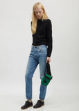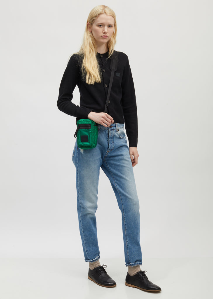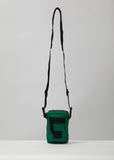 Green-and-black unisex pouch crossbody bag crafted of ripstop nylon canvas—a softly structured rectangular style ideal for carrying smartphones, keys, and small essentials. Features the brand’s signature embroidered Face appliqué at the front.
