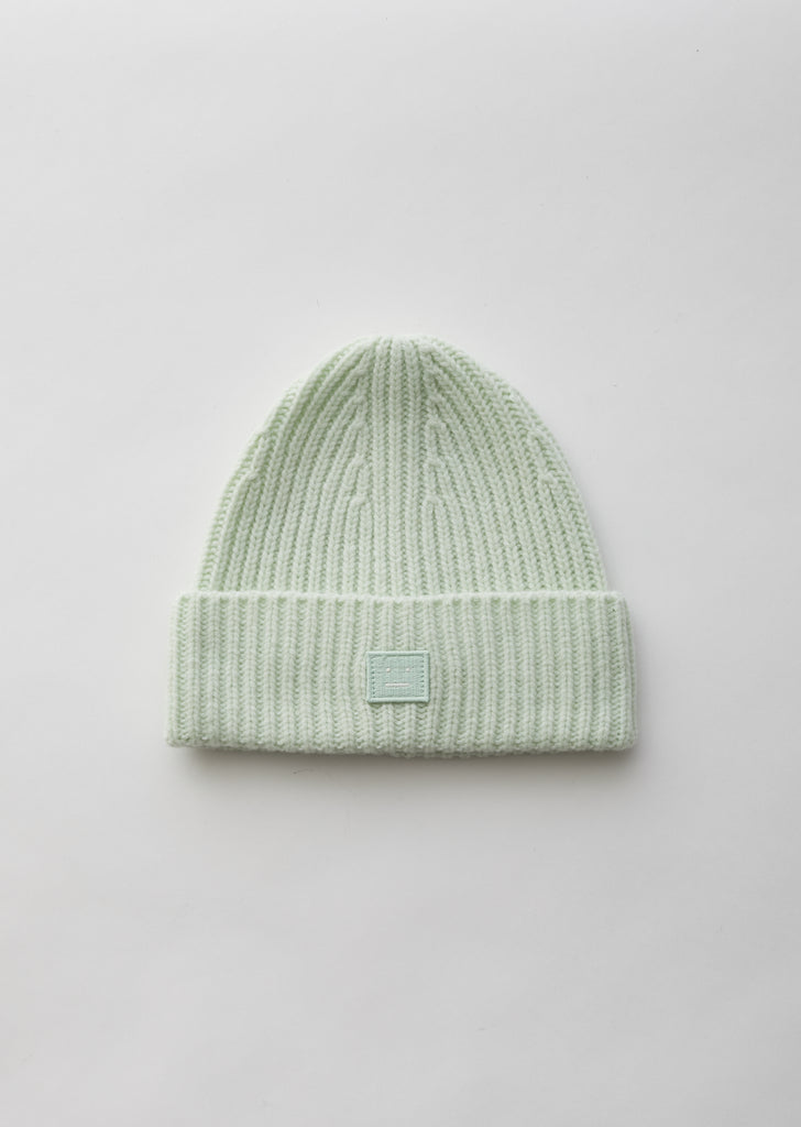 Seafoam-green mini beanie rib-knitted from worsted lambswool, finished with the brand’s signature emoji Face appliqué at the foldover cuff.