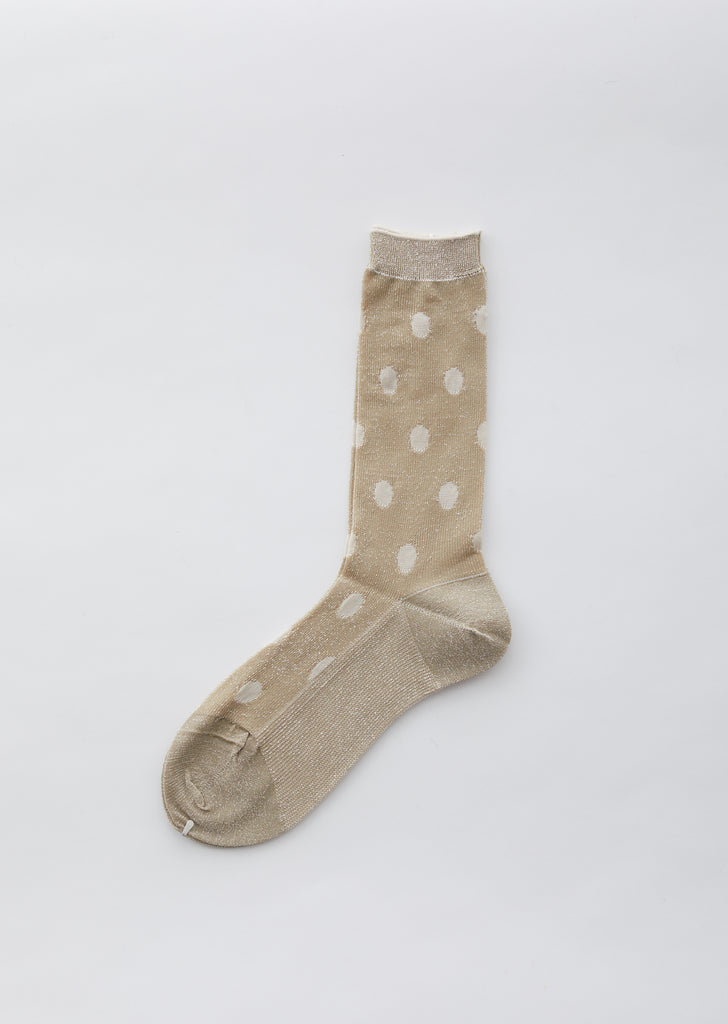 Fine-gauge-knit mid-calf socks crafted from gold and taupe Lurex, finished with cream-tone jacquard-knit polka dots and a cream-tipped stockinette-stitched cuff. White logo stamp at sole.