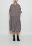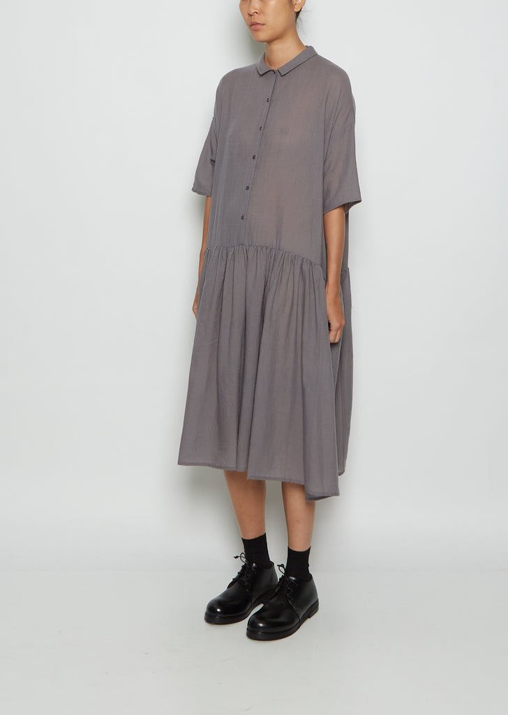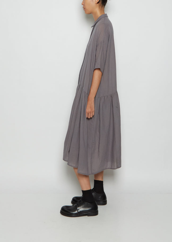 Apuntob mid-grey short sleeve short dress with a half buttoned placket and shirred full skirt crafted in a lightweight wool gauze. Features the brand signature mini collar.