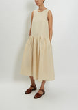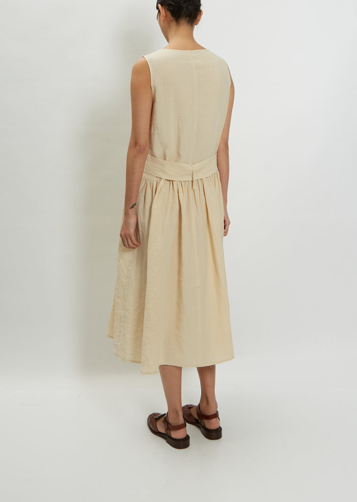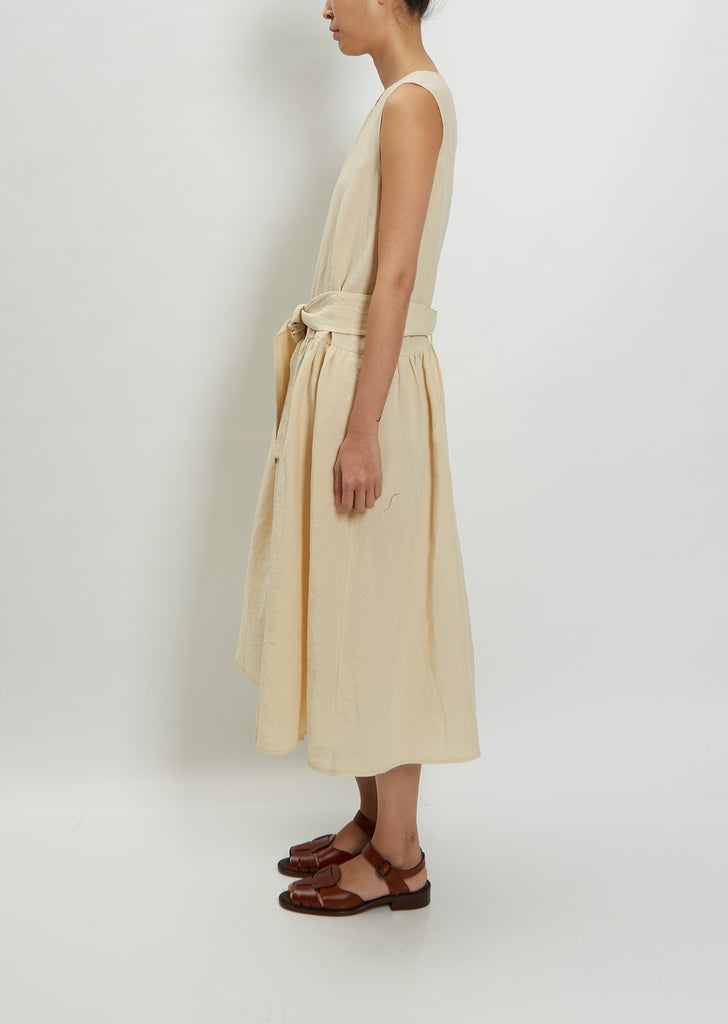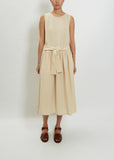 Apuntob pale butter yellow sleeveless midi-dress with a gathered skirt and detachable self belt in a textured linen.