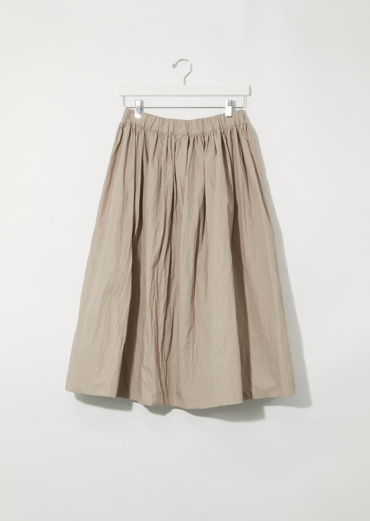 Apuntob Paper Full Skirt in Sabbia. Elastic waist gathered full skirt in a sand colored crinkled paper-texture cotton with and nylon mid-weight fabric.