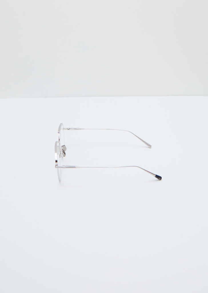 Blanc Glasses 024 in Silver/Clear. Silver titanium wire-frame opticals with clear lens and slim arms with one side dipped in black acetate — a signature detail from the Japanese label.