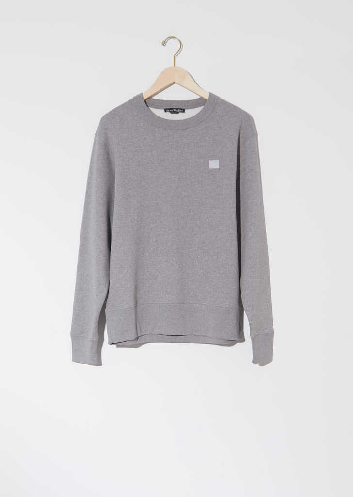 Acne Studios Unisex Fairview Face Sweatshirt in Light Grey Melange. Signature classic fit sweatshirt with dropped shoulders crafted from midweight loopback jersey. Accented with the Acne Studios face-embroidered patch on the chest.