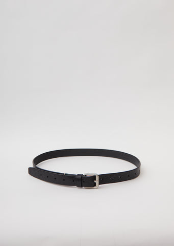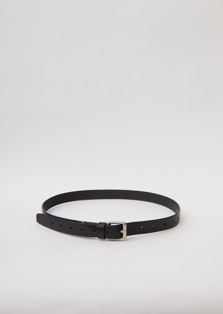 Lemaire Leather Belt in black leather belt with matte silver-toned buckle. Reversed stitching detail along the belt edges and exposed natural color stitch near buckle.