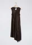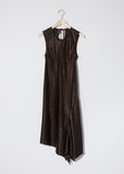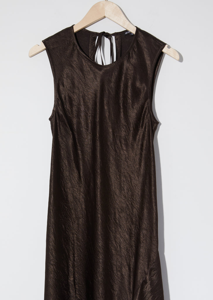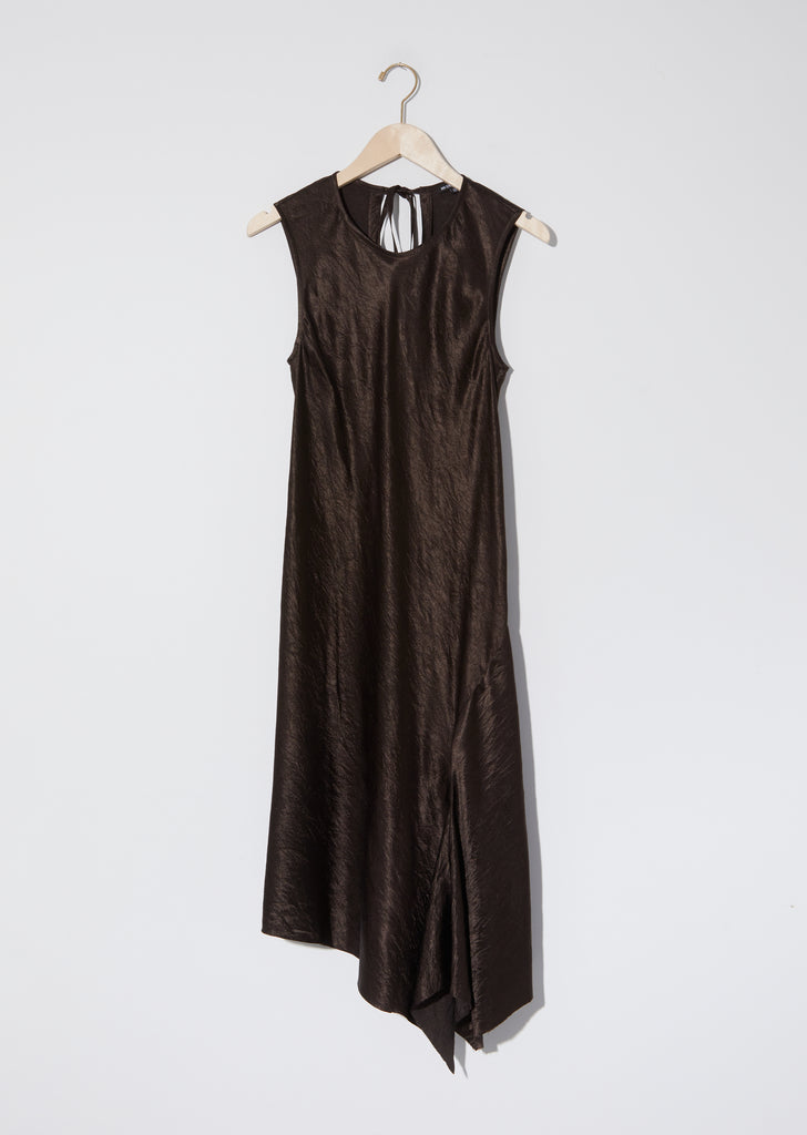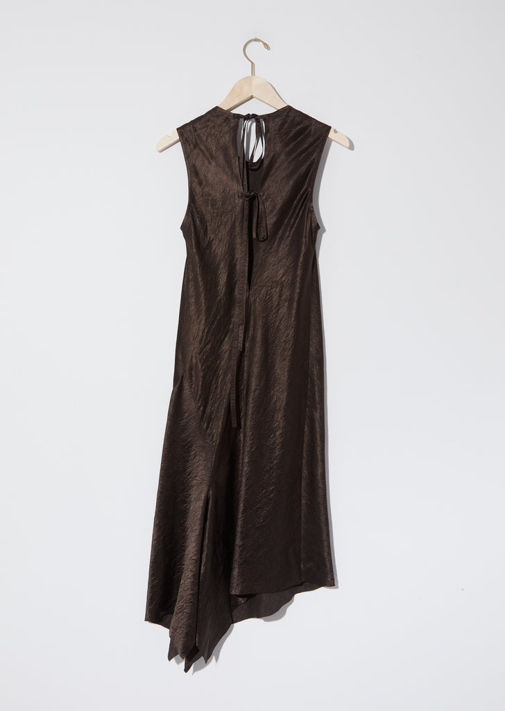 FW'20 Collection — Dark brown sleeveless bias-cut dress with a panel construction and an asymmetrical hemline. Featuring an open back with two self ties.