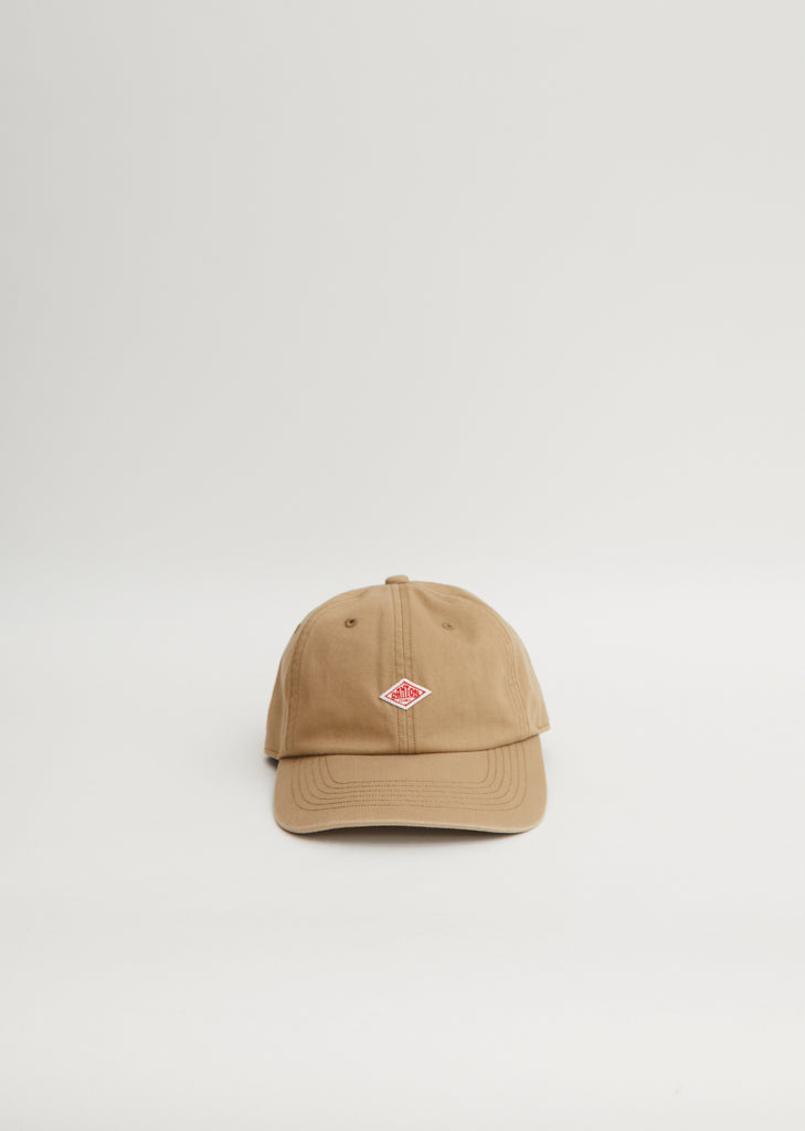 Danton unisex baseball cap in beige cotton twill, finished with the Japanese label's signature red-and-white embroidered logo appliqué at the front of the crown.