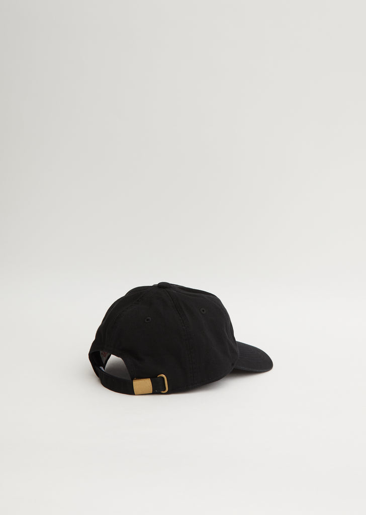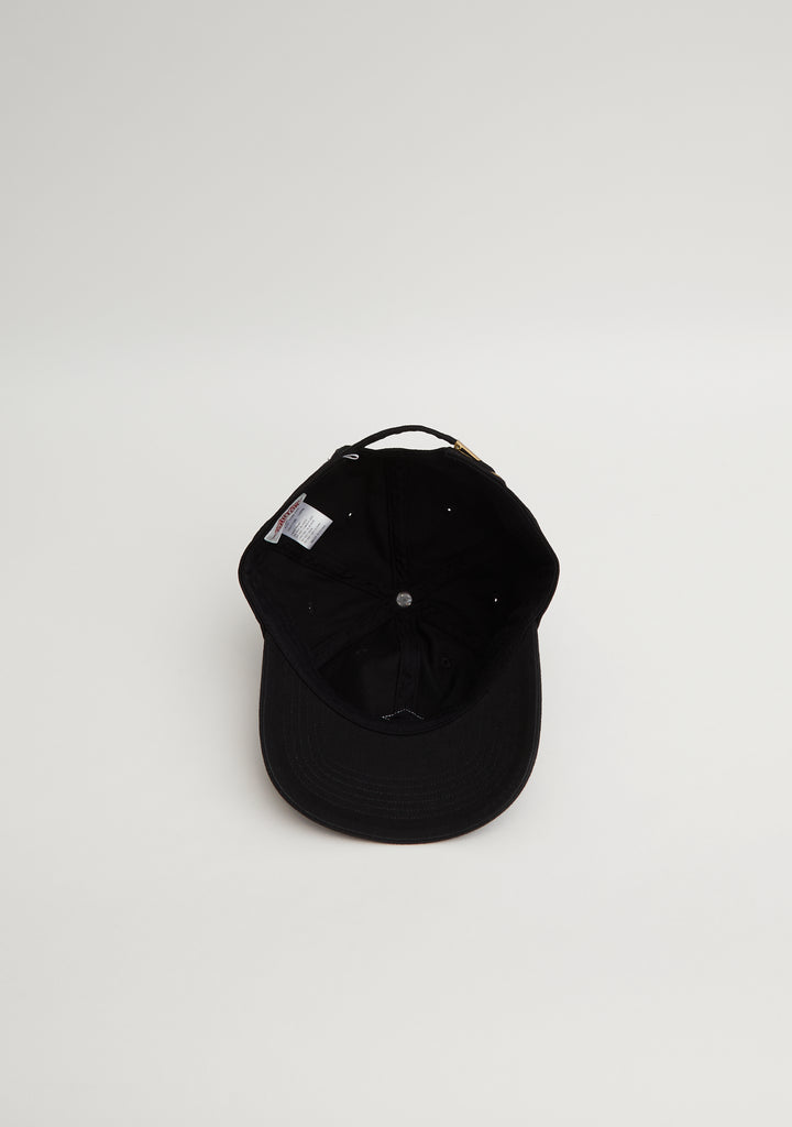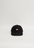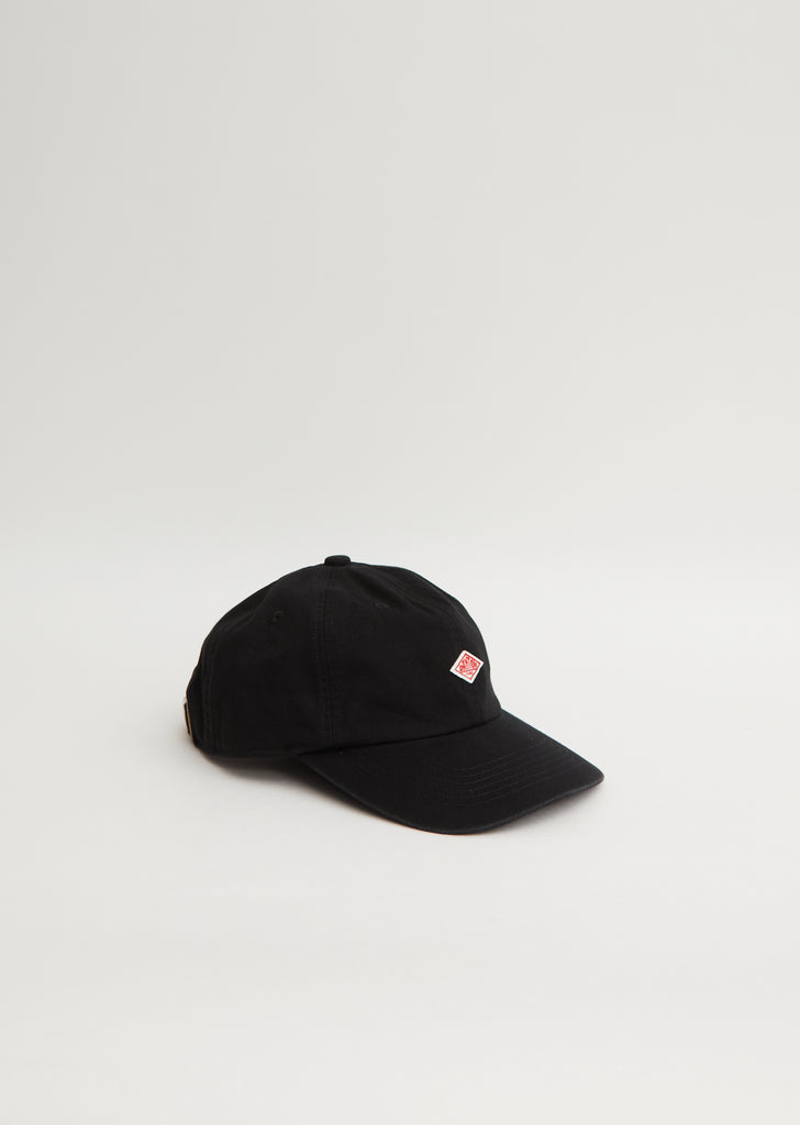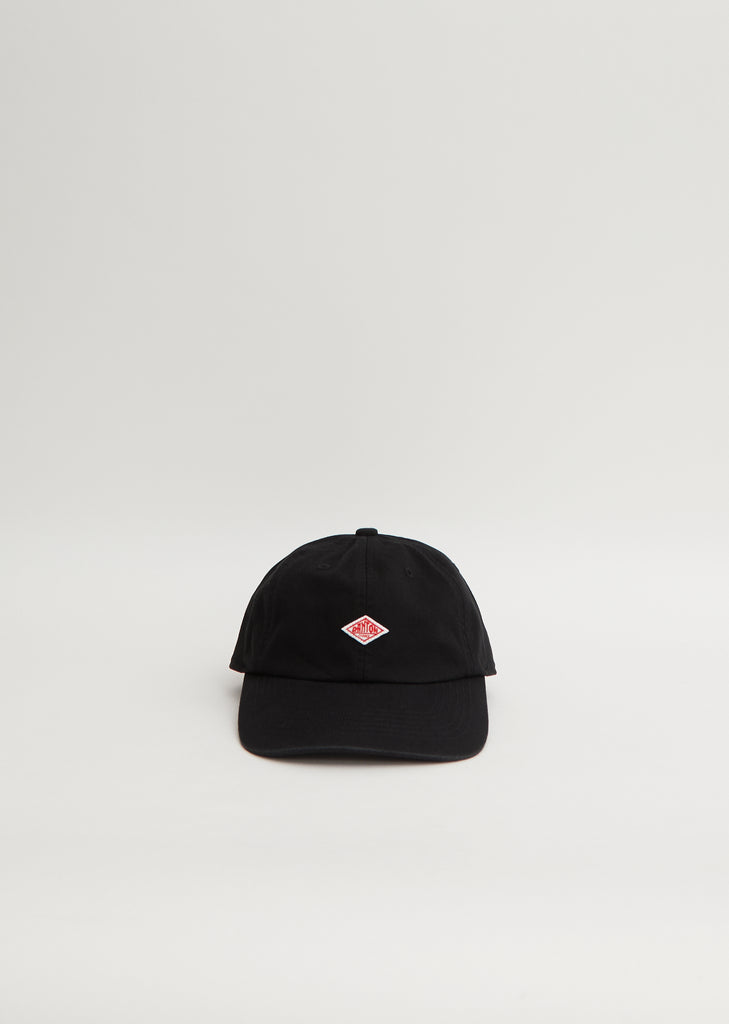 Danton unisex baseball cap in black cotton twill, finished with the Japanese label's signature red-and-white embroidered logo appliqué at the front of the crown.