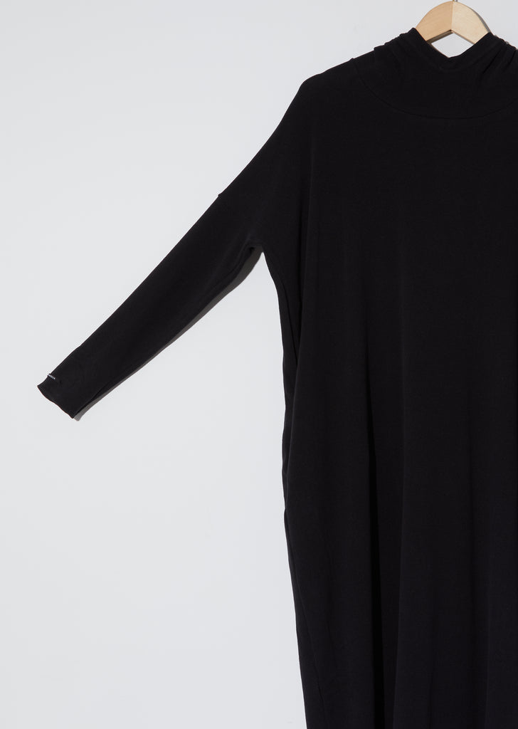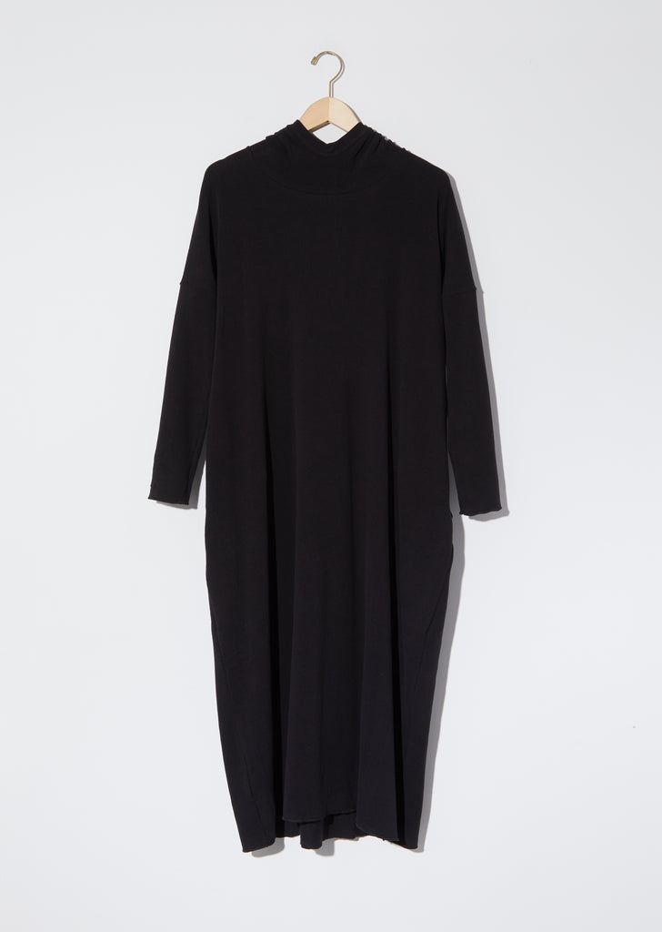Album di Famiglia Long Hooded Dress in Black. Long plush jersey dress with a hood in a soft, cotton blend fleece. Easy popover dress with a loose fit and slimmer sleeves on a dropped shoulder.