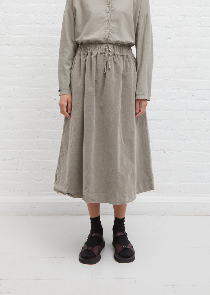 Album di Famiglia signature gathered skirt with elasticated waist in washed cotton velvet. Concealed side seam pockets.