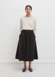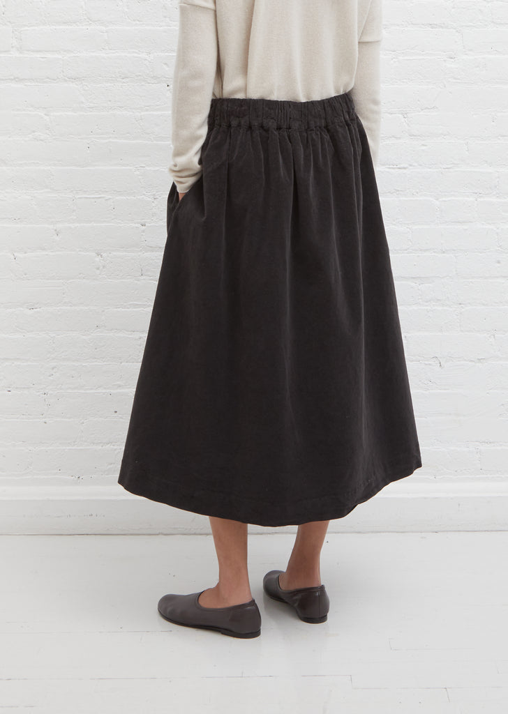 Album di Famiglia moka brown signature gathered skirt with elasticated waist in washed cotton velvet. Concealed side seam pockets.