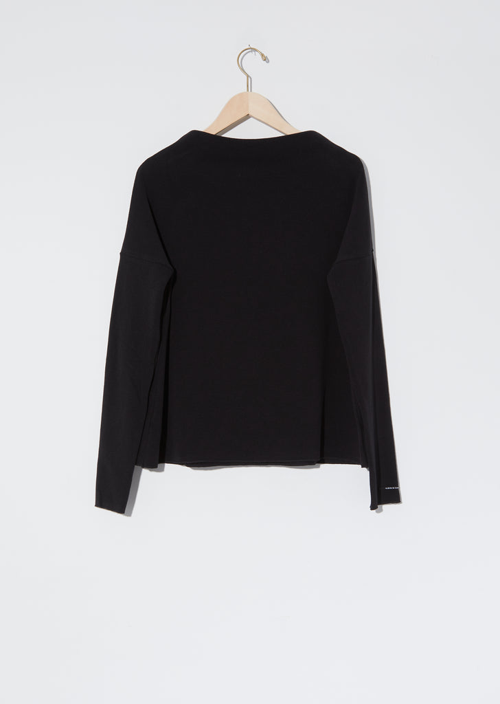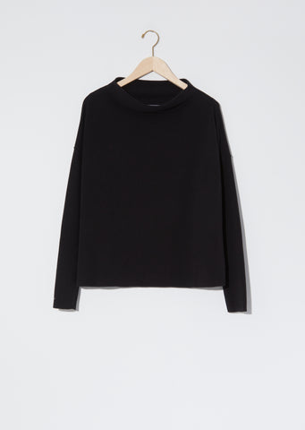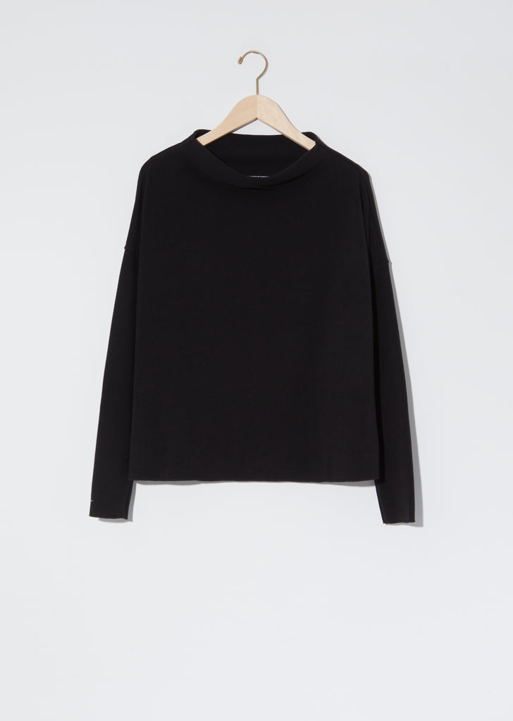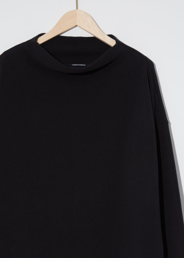 Album di Famiglia High Neck Top in Black. Signature basic pullover with a high cowl neckline in a soft, plush jersey with a hint of stretch for comfort. Features a loose fit and signature slim sleeves.