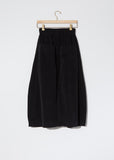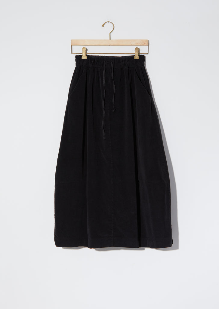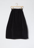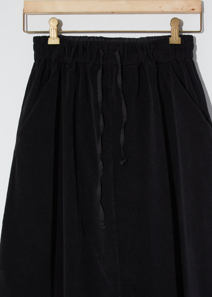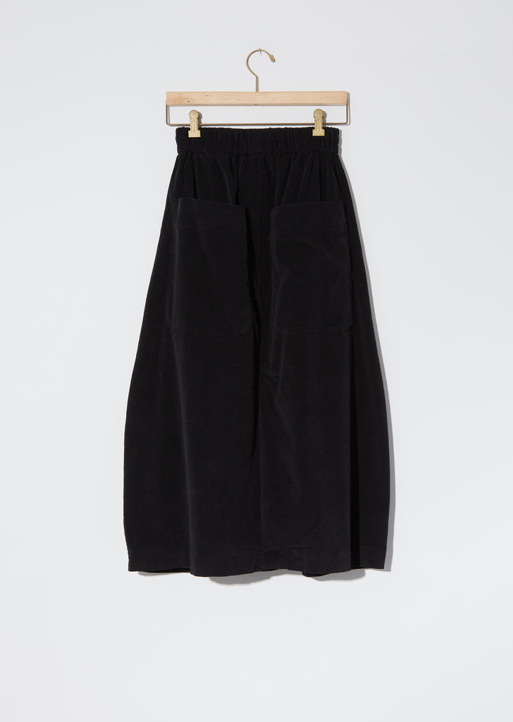 Album di Famiglia Velvet Skirt in Black. Black elasticized waist balloon-shape skirt in a soft velvet. Features this season's back patch pocket detailing and back vent.