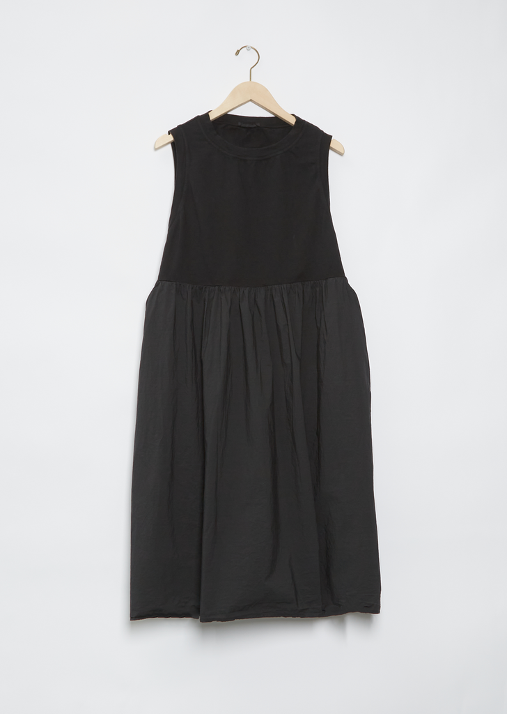 Album di Famiglia black tank dress with scoop armholes in mid-weight cotton jersey with tonal gathered skirt and scoop side pockets in lightweight tissue cotton.