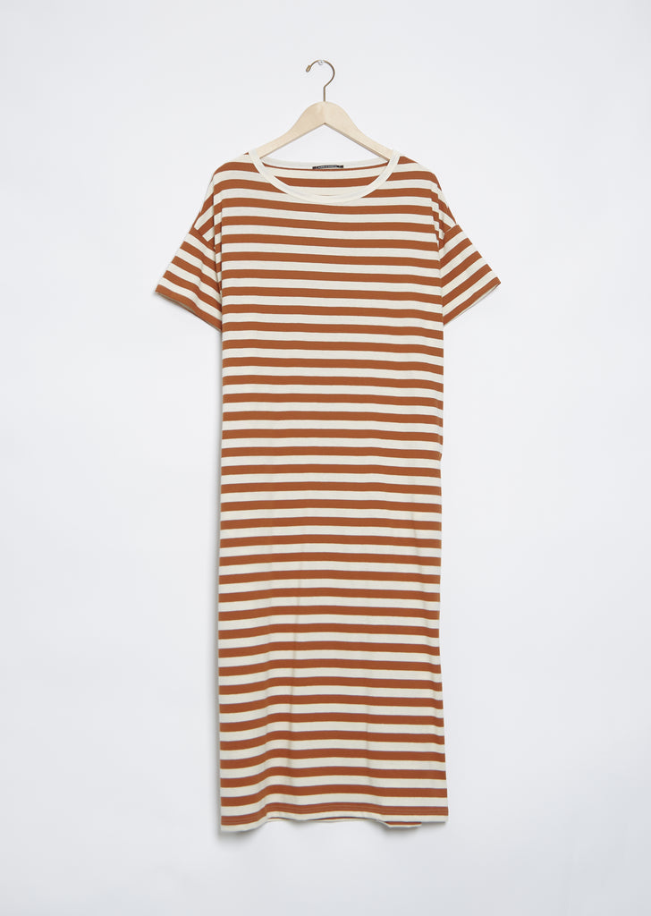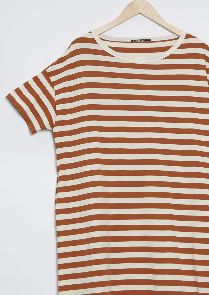 Album di Famiglia dune brown and ivory striped t-shirt dress in a soft cotton jersey knit.