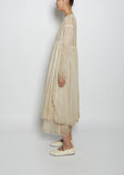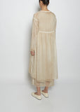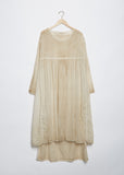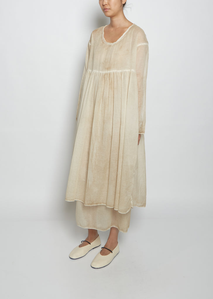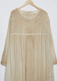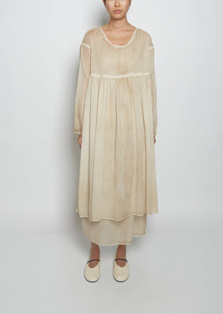 Album di Famiglia desert beige double-layer dress with empire waist and loose long sleeves crafted in tie-dyed cotton gauze. Loose inner layer can be worn separately.