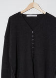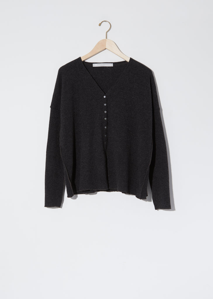 Album di Famiglia Cardigan WS in Almost Black. Crafted in all cashmere, charcoal grey V-neck cardigan with half open placket, reverse seam detailing and finished with small Mother-of-pearl buttons. This cardigan is lightweight, and can be worn as a V-neck pullover.