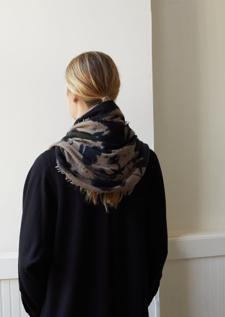 Rectangular fine-knit brushed-cashmere scarf featuring green and navy ink-blot designs against a brown-taupe backdrop. Self-fringed edges.