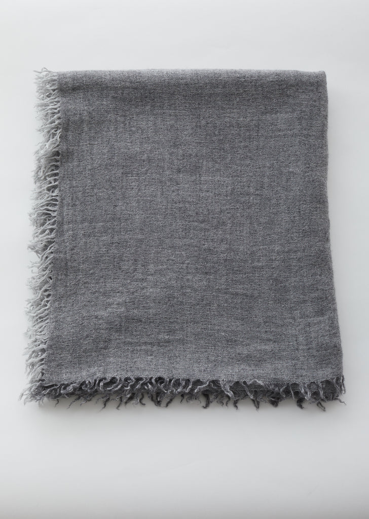 Rectangular knit scarf crafted from light-grey cashmere-silk-lambswool gauze. Self-fringed edges.