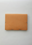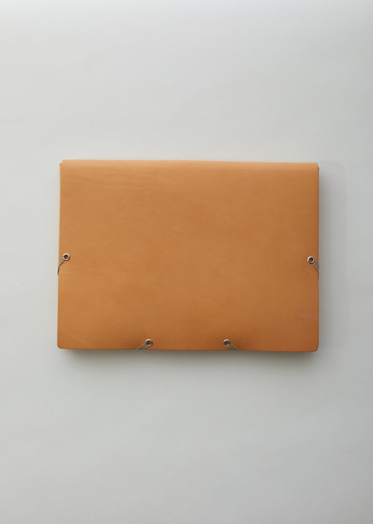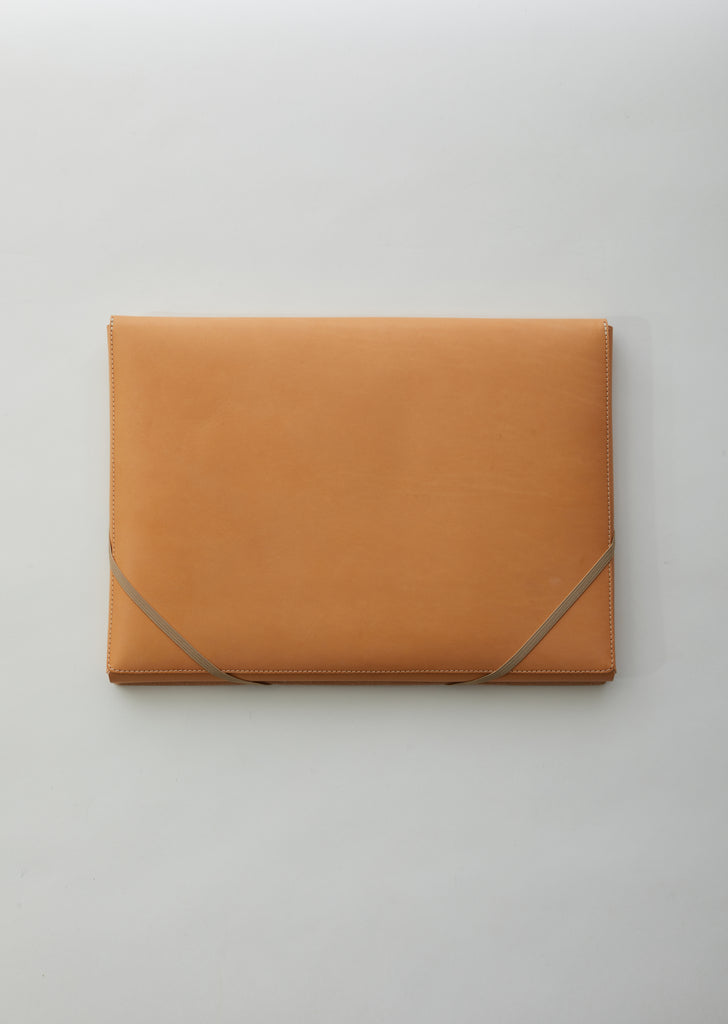 Natural-tone covered folder in double-tanned full-grain calf leather, finished with a natural vegetable wax that allows a beautiful patina to develop over time. Can be used to hold A4-sized documents or as a handheld laptop case.