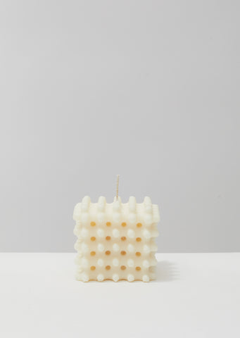 White hand-poured candle made from ecologically sourced soy, palm, and bee’s waxes. Crafted using a 3D-printed mold, this unscented, cube-shaped candle features distinct architecture-inspired nodules. The lead-free cotton wick burns in a cylindrical core that allows the sides to retain their shape and appear illuminated all over. Can serve as a tea-candle holder after 60 hours of burn time.