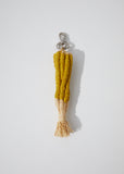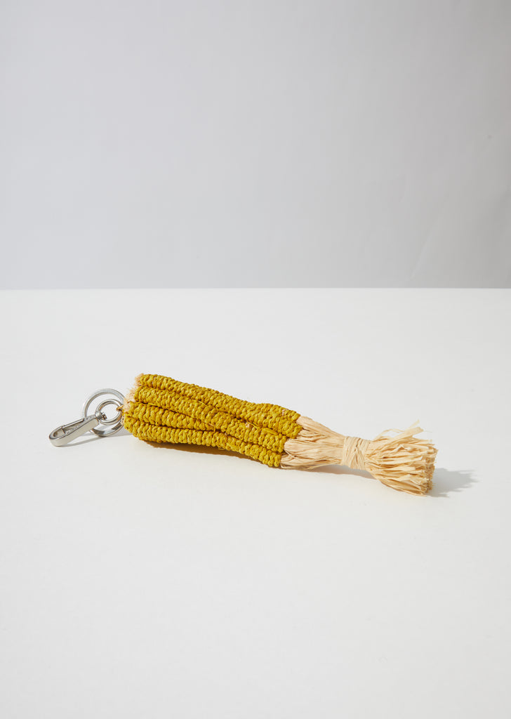 Polished silver-tone metal key ring adorned with a golden-yellow woven-raffia corncob charm.
