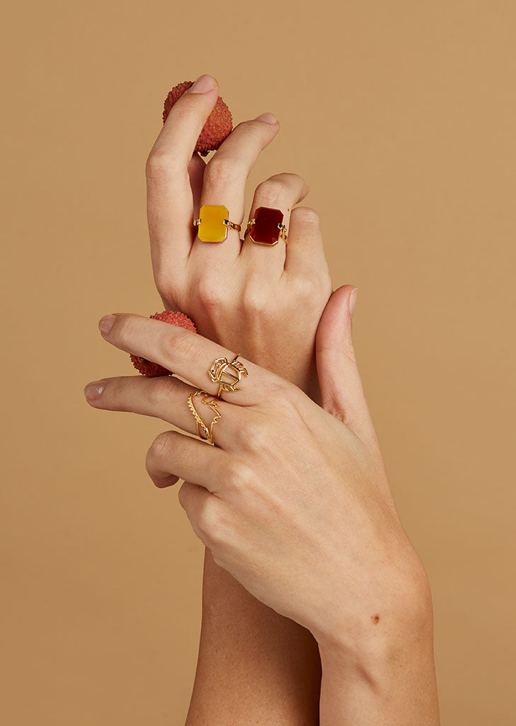 Aliita iconic sandwich deco ring in yellow gold with red cornelian and yellow jade stones.