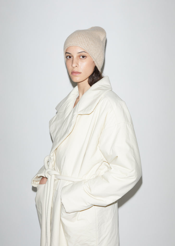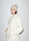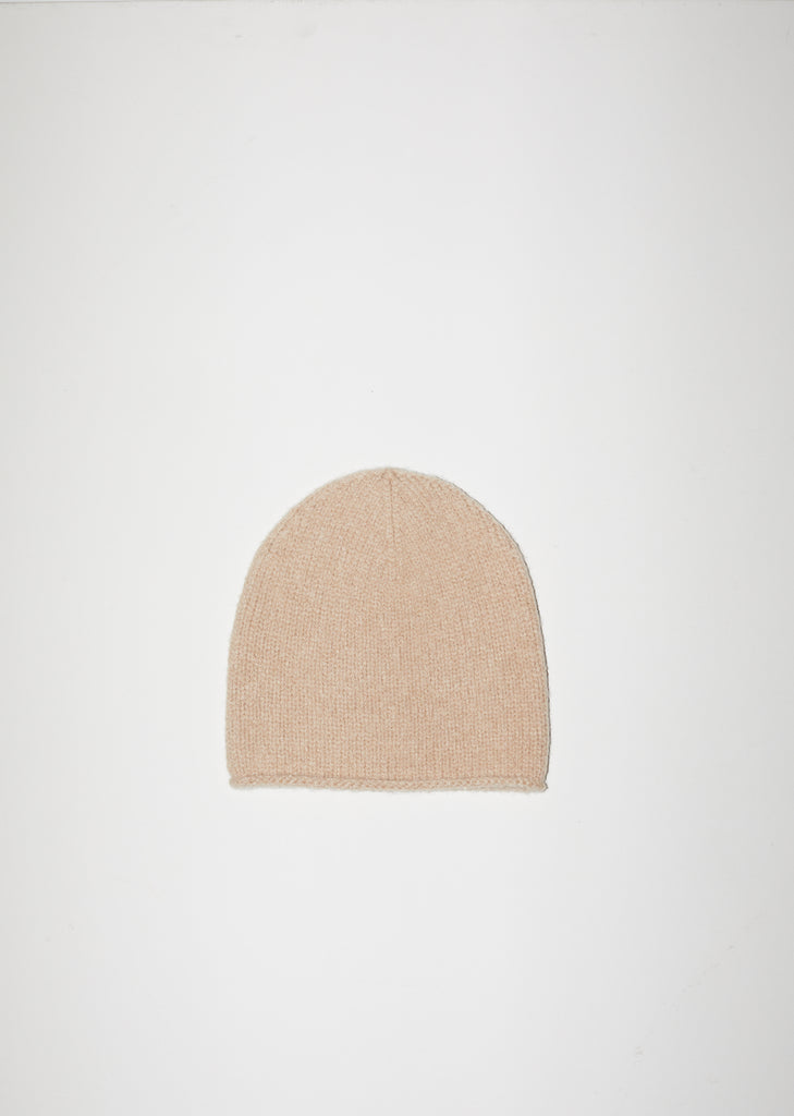 Unisex hand-knit beanie stockinette-stitched from beige super-baby-alpaca yarn, finished with a gently rolled edge.
