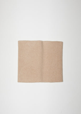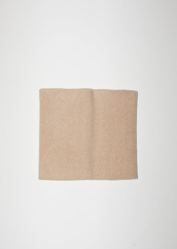 Möbius-inspired neck funnel stockinette-stitched from  beige super-baby-alpaca yarn. Slips over. Hand-loomed.