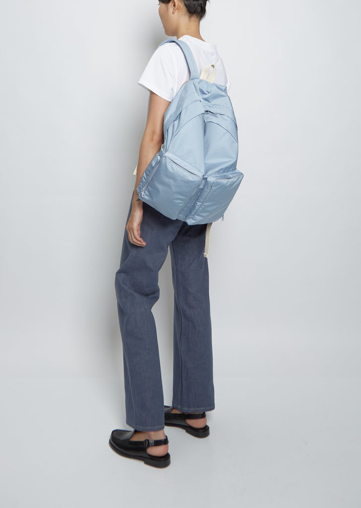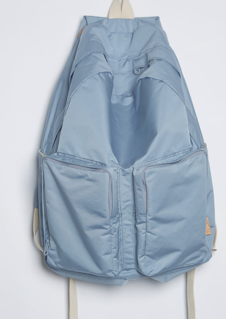 Amiacalva signature sky blue backpack with adjustable cushioned shoulder straps and two exterior zip-around front pockets in a soft sheened nylon.
